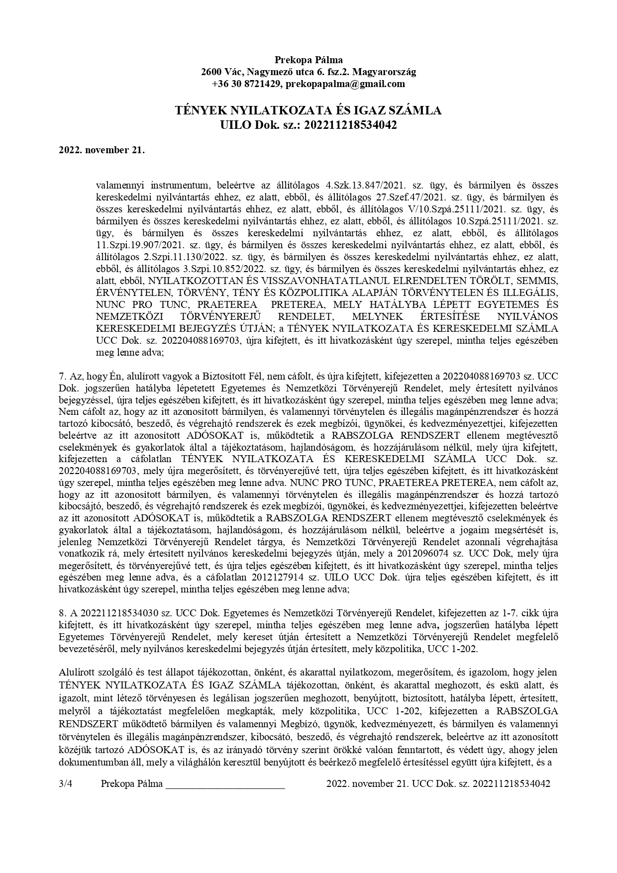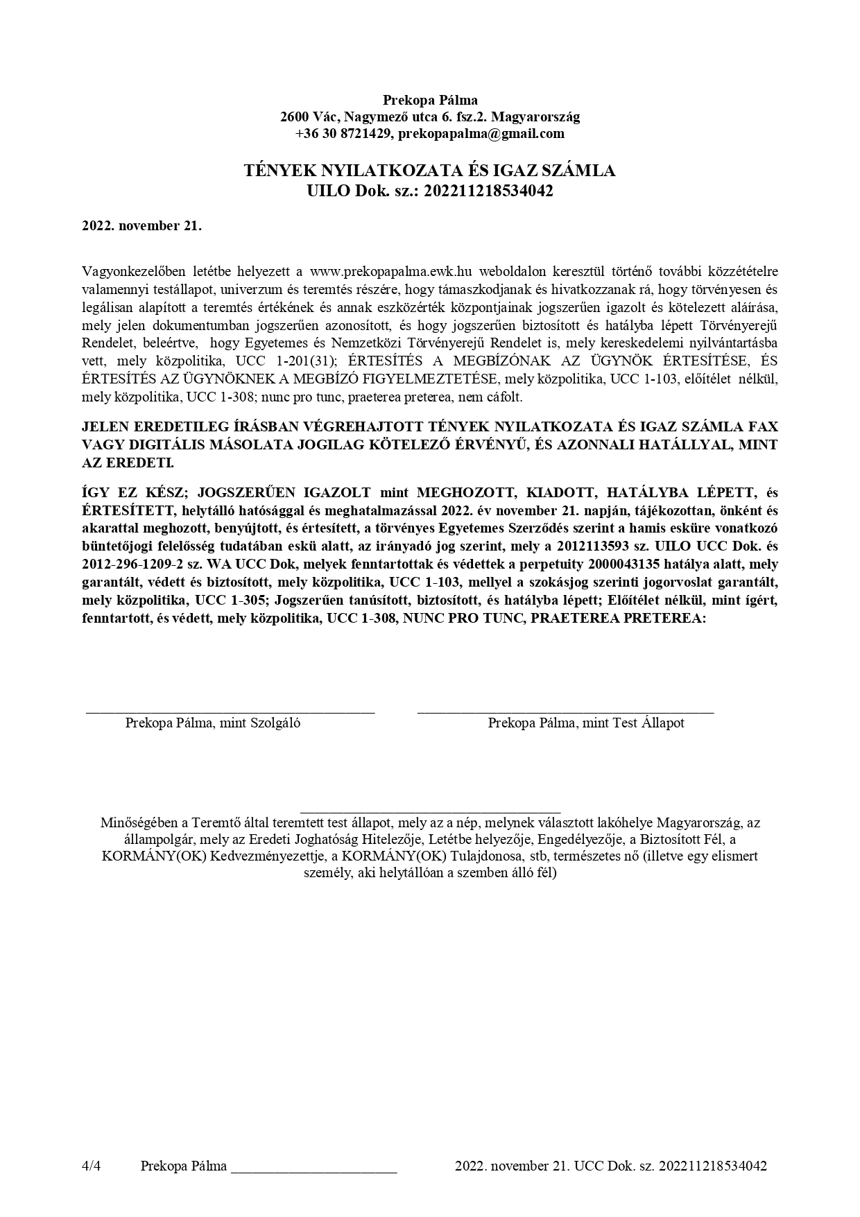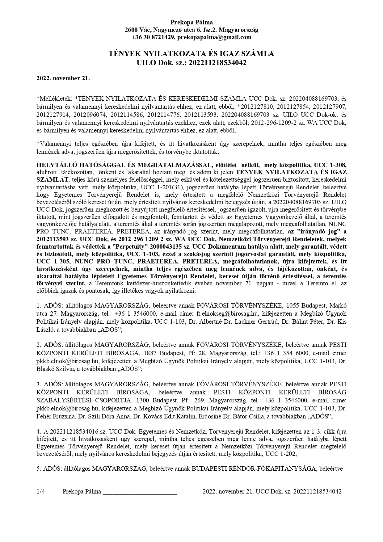 DECLARATION OF FACTS & TRUE BILL UILO Doc. No. 202211218534042 és magyar fordítása (TÉNYEK NYILATKOZATA ÉS IGAZ SZÁMLA)
