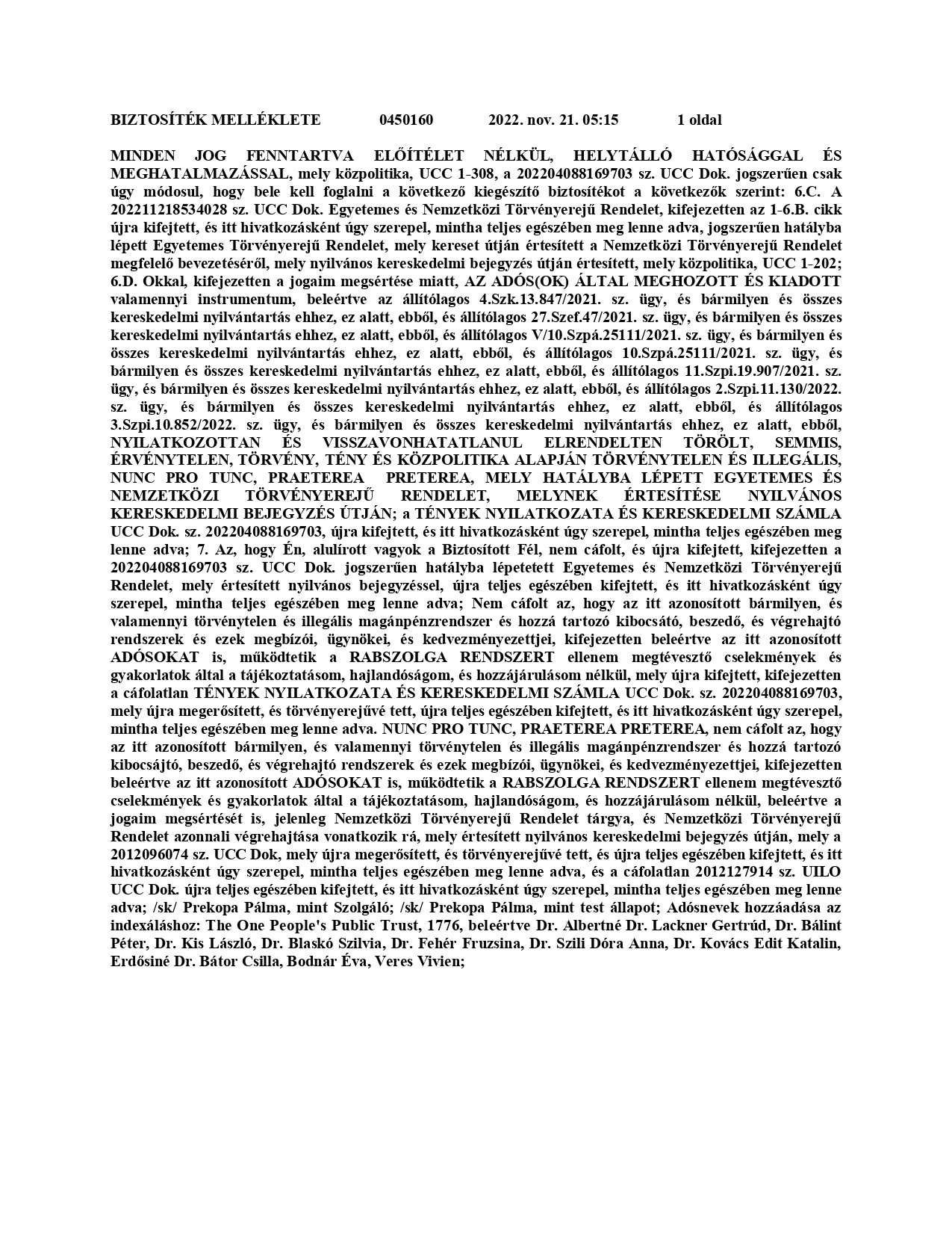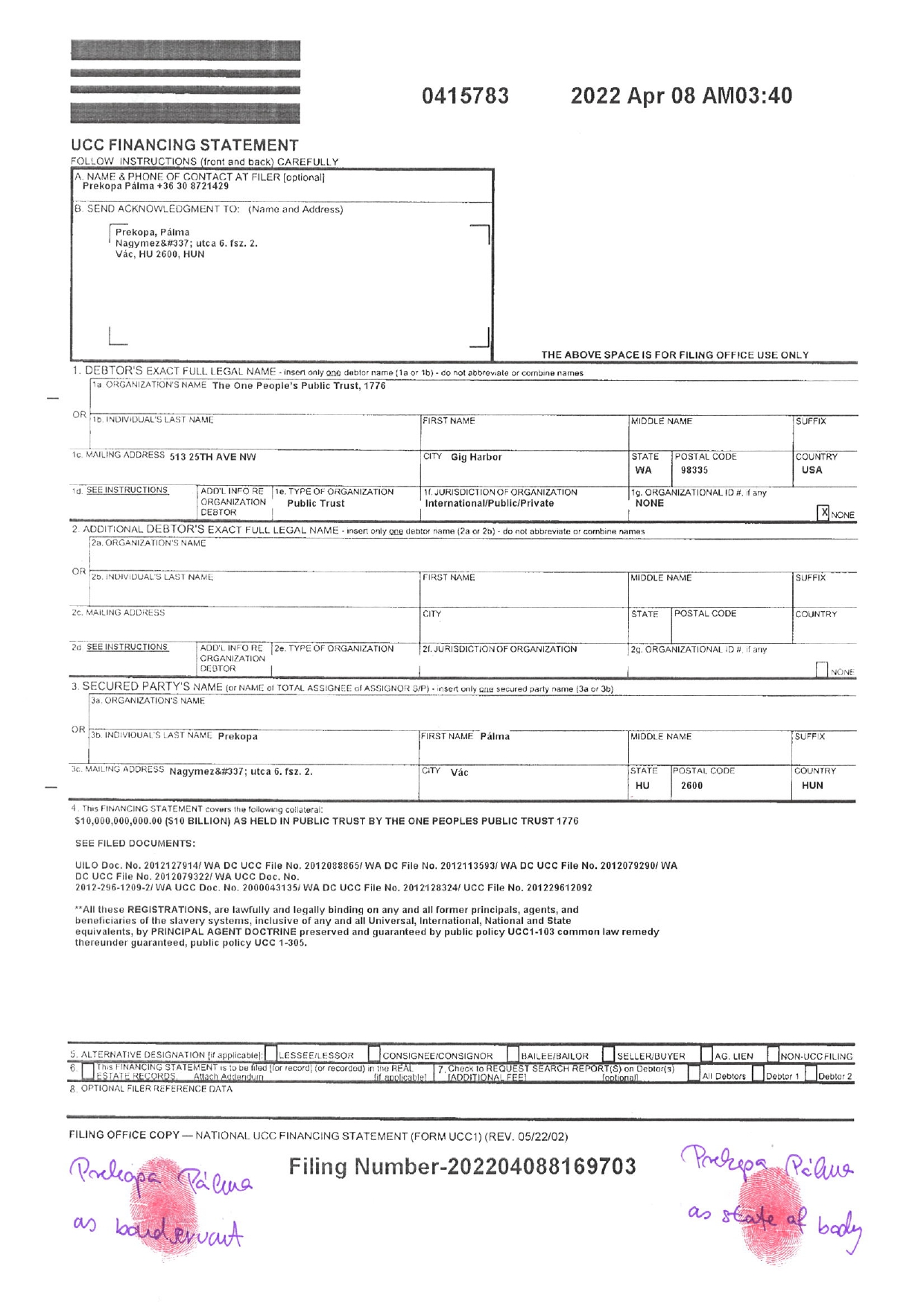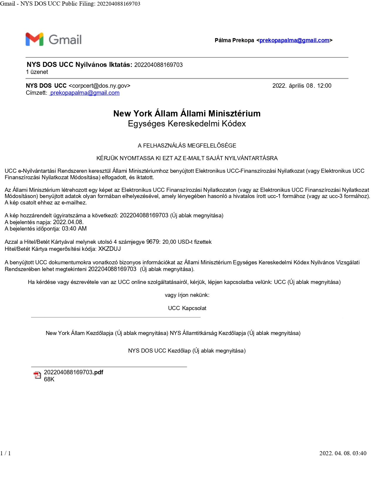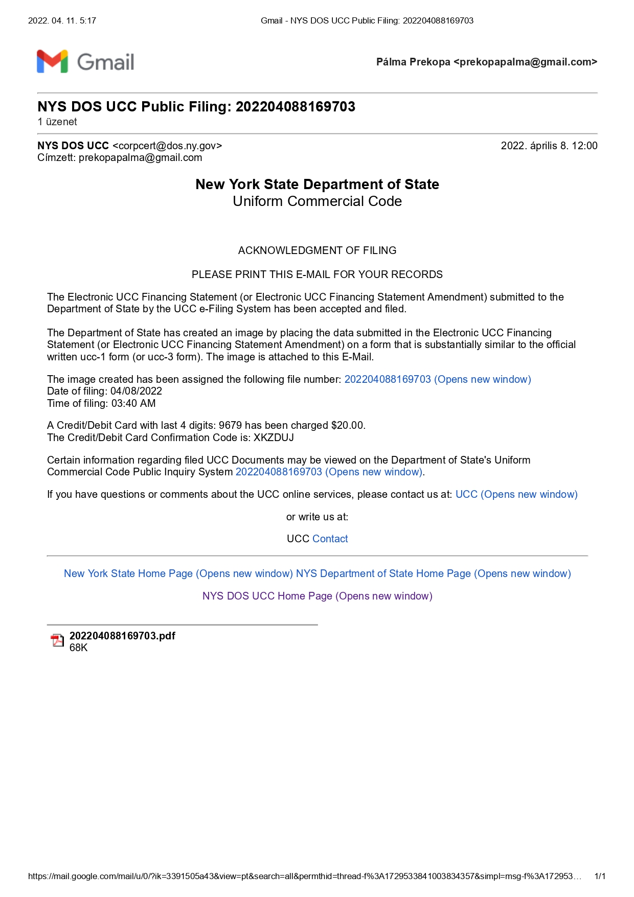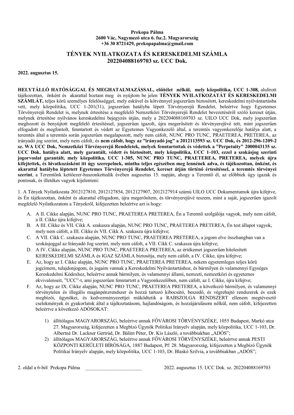 202204088169703 sz. UCC FINANCING STATEMENT (UCC FINANSZÍROZÁSI NYILATKOZAT) (UCC Dok.), és annak elfogadása ("irányadó jog”: 2012-296-1209-2 sz. WA UCC Dok.: „..Ez az egyetlen elfogadás, amit kap…”), és ezek magyar fordításai: