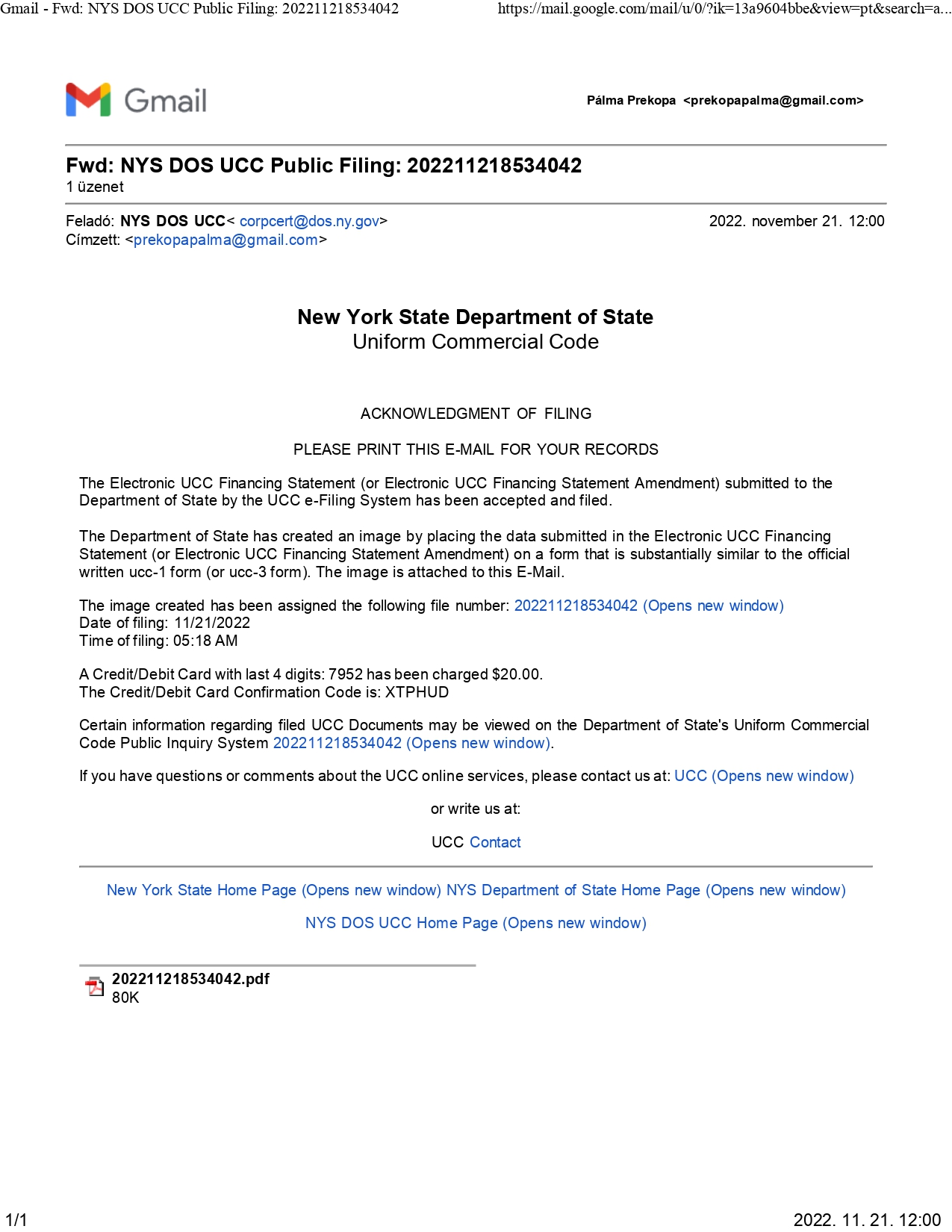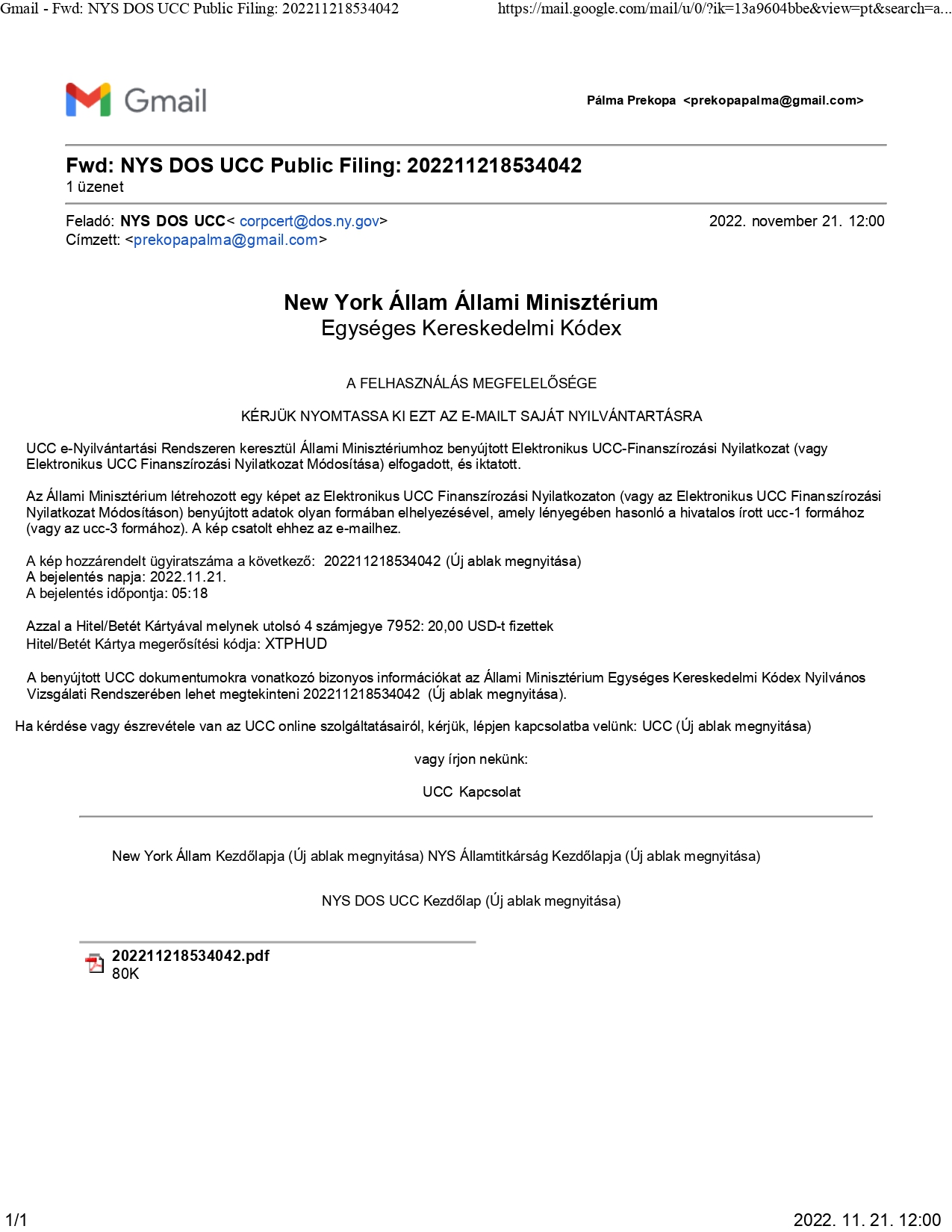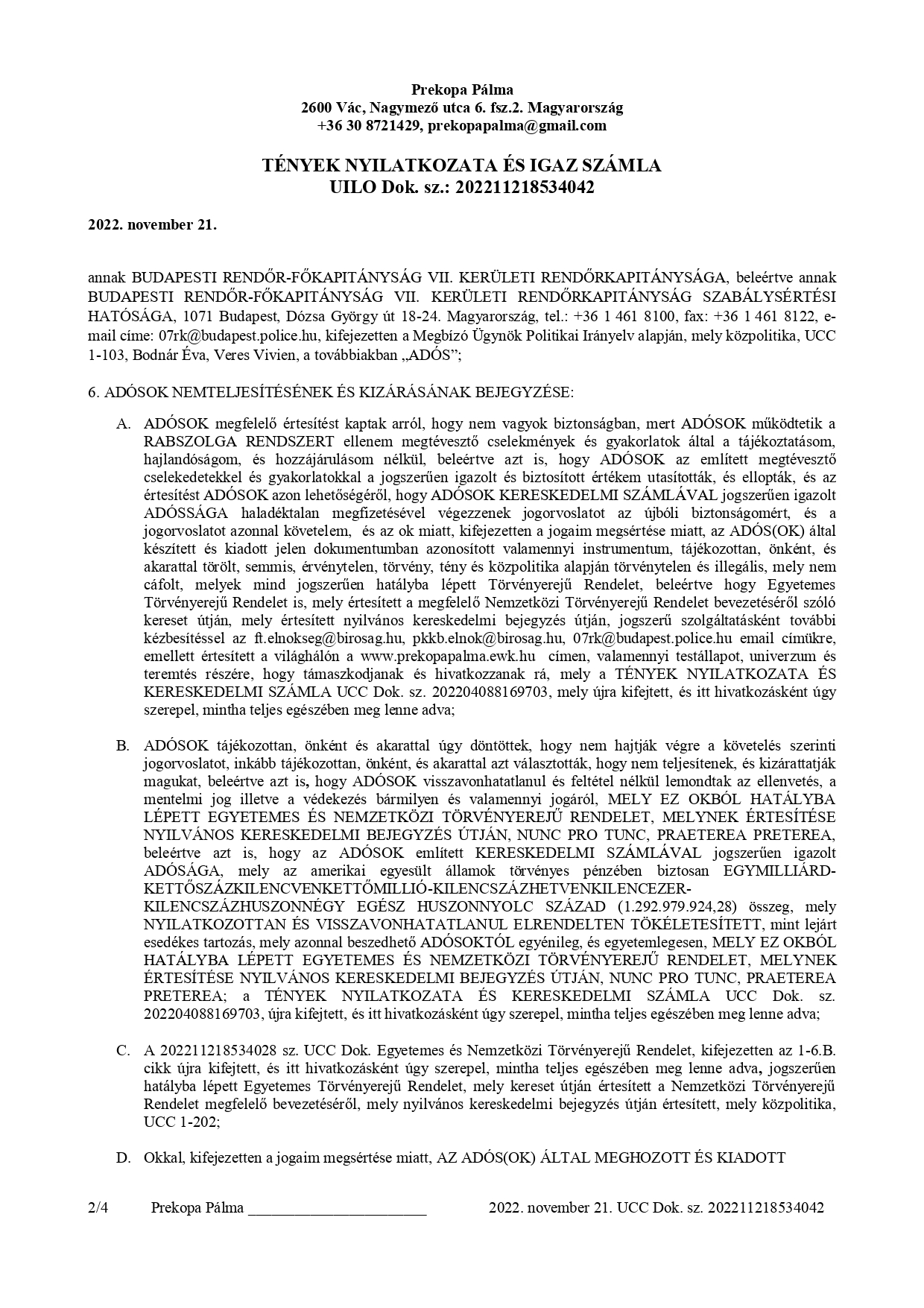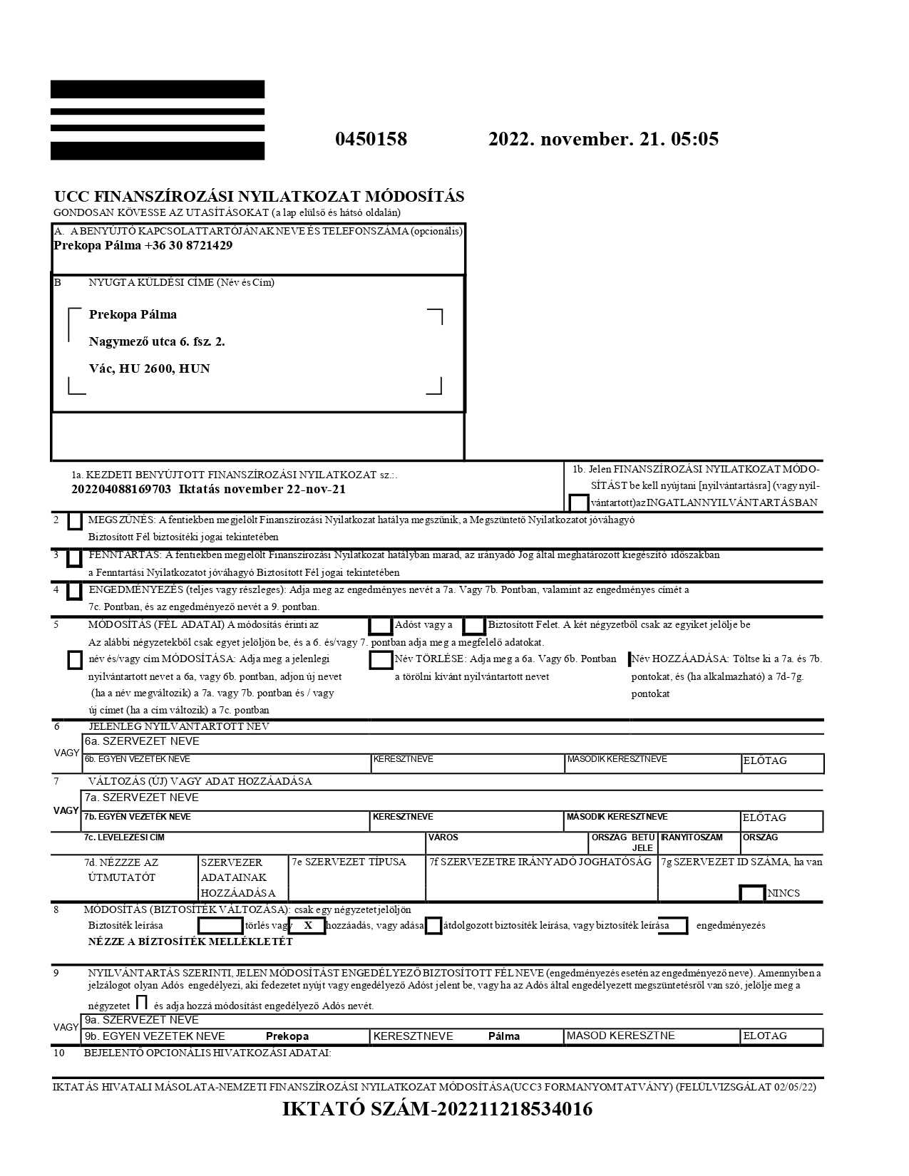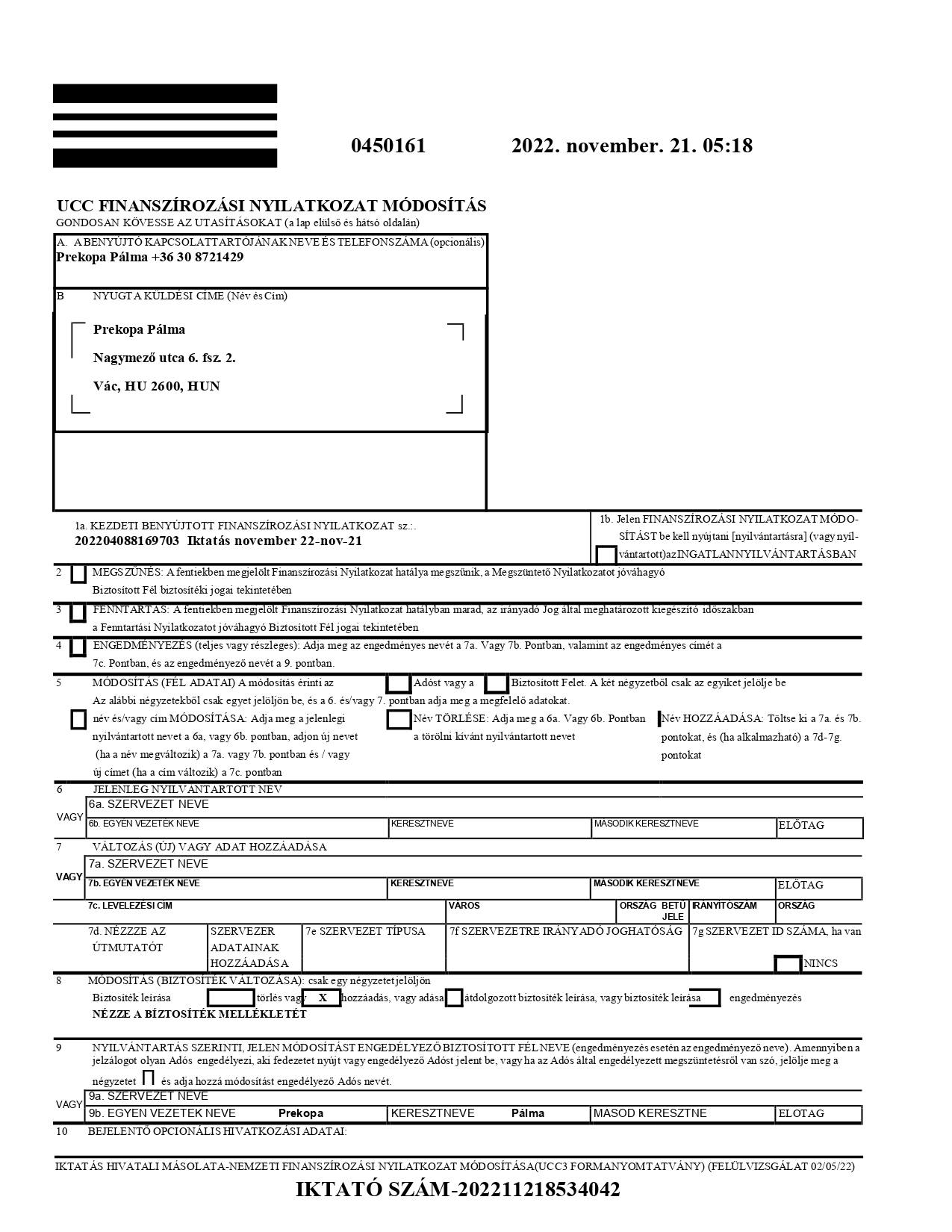202211218534042 sz. UCC FINANCING STATEMENT AMENDMENT (UCC FINANSZÍROZÁSI NYILATKOZAT MÓDOSÍTÁS) (UCC Dok.), és annak elfogadása ("irányadó jog”: 2012-296-1209-2 sz. WA UCC Dok.: „..Ez az egyetlen elfogadás, amit kap…”), és ezek magyar fordításai: