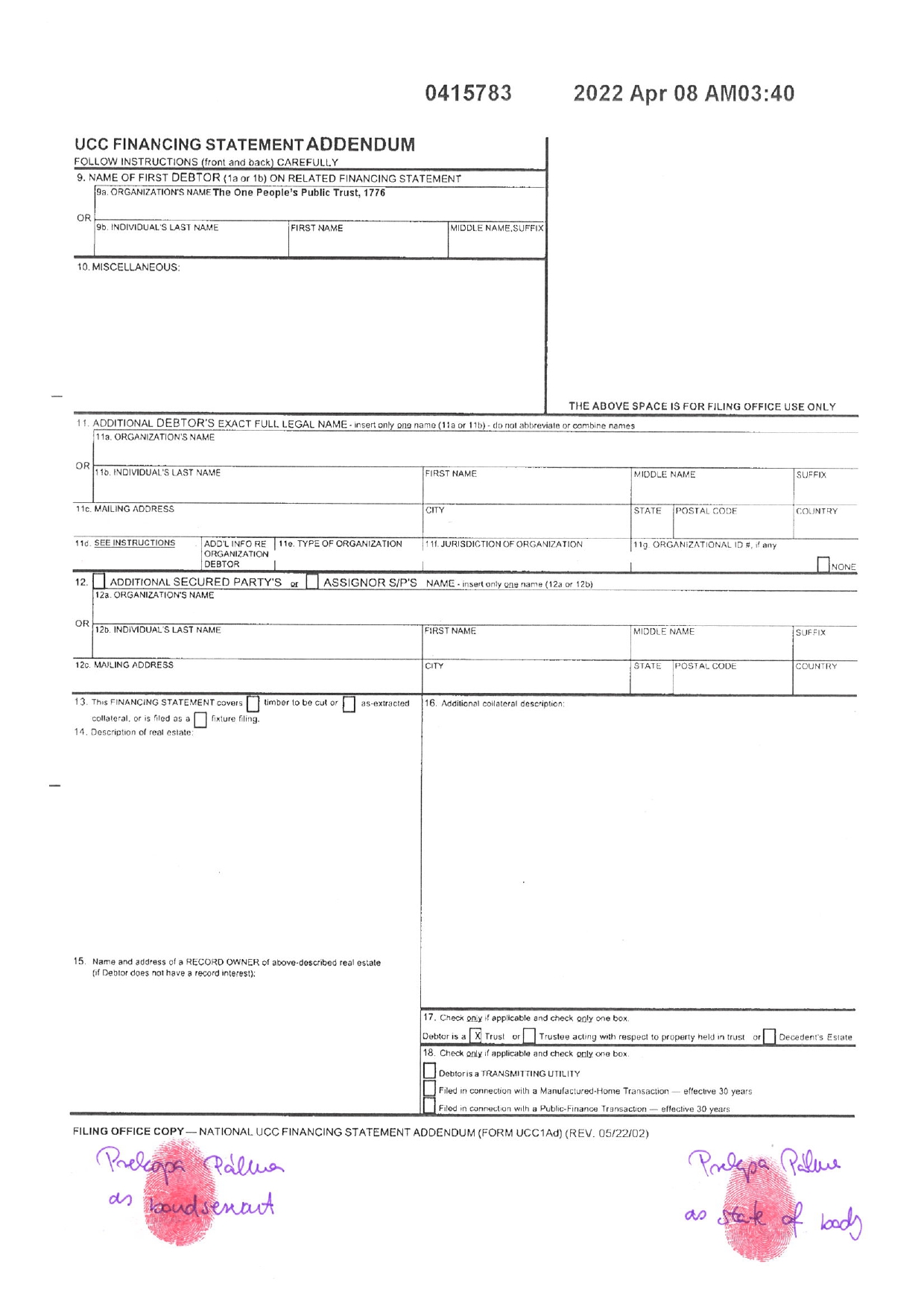 A UCC, beleértve bármilyen és valamennyi **állami, **nemzeti, **nemzetközi és **egységes ekvivalensét is, jogszerűen BEJEGYZETT kizárólagos és megsemmisíthetetlen jogcímmel, tulajdonjoggal, és jogokkal, mely jogszerűen biztosított a bolygón élő összes embernek, egyformán, Egységesen, UCC nyilvántartási számai 2000043135 (az eredeti nyilvántartott ”perpetuity”), 2011055259, 2011051841, 2011055260, 2011125781 (az engedményezéssel BEJEGYZETT ajándék), 2012012675 és 2012025545 (az ajándék elfogadásának BEJEGYZÉSE).