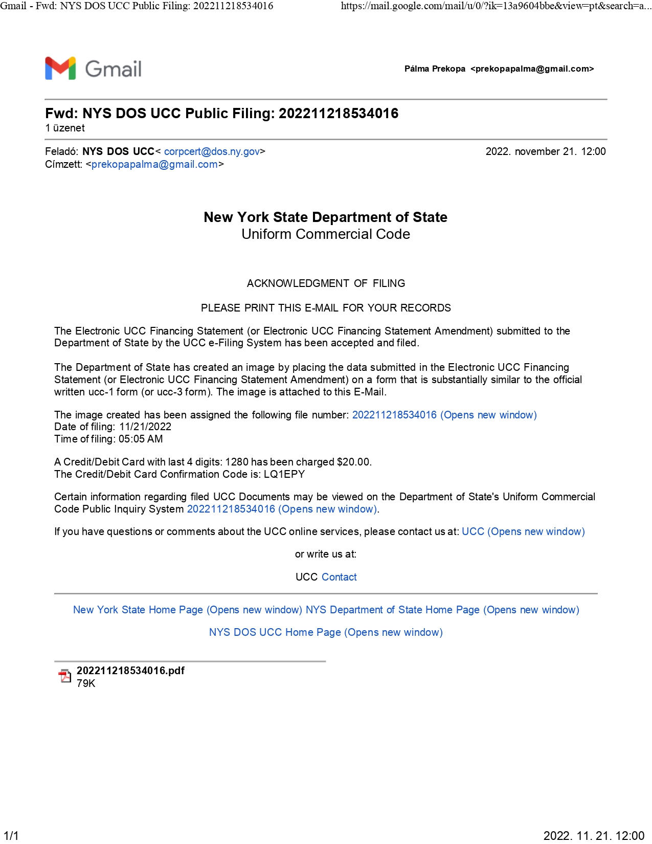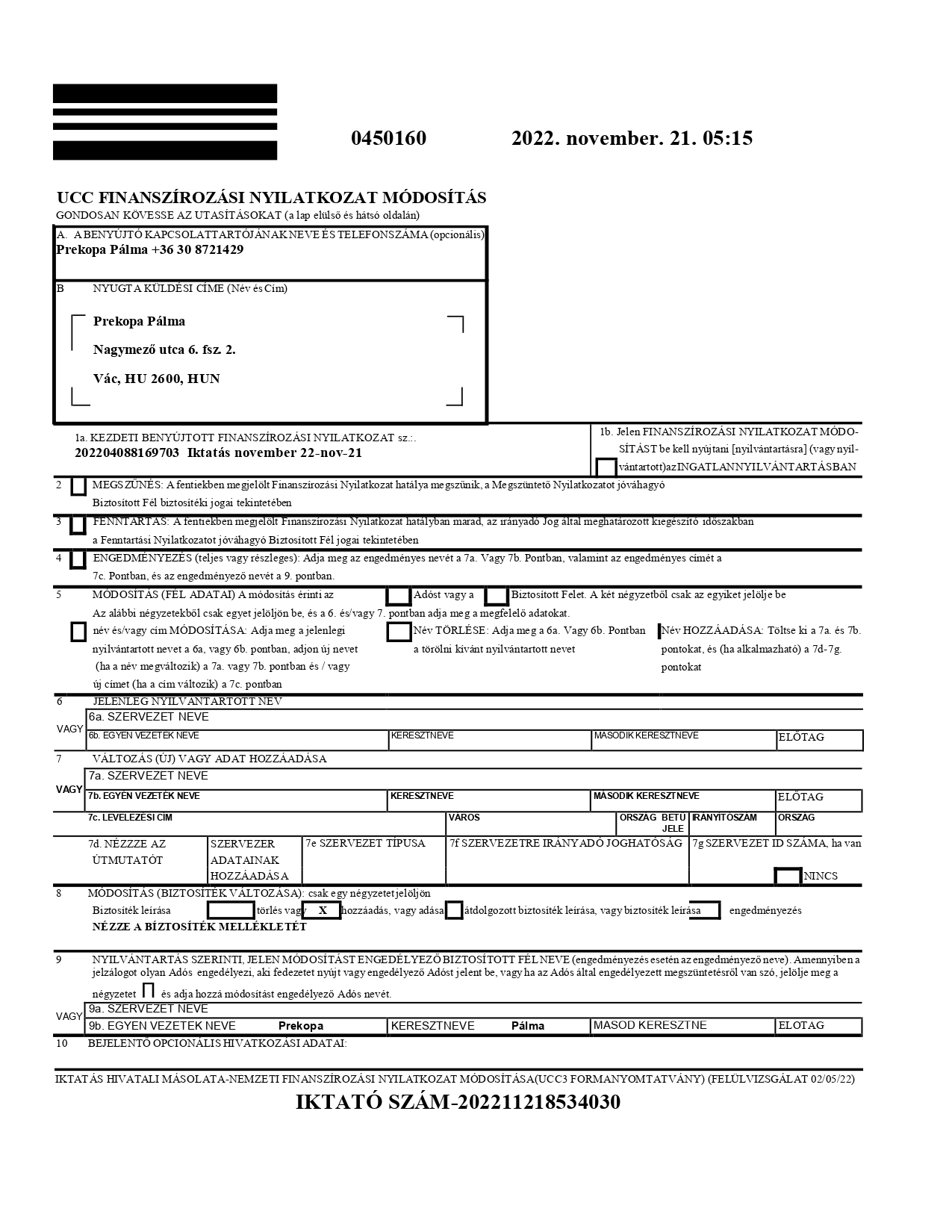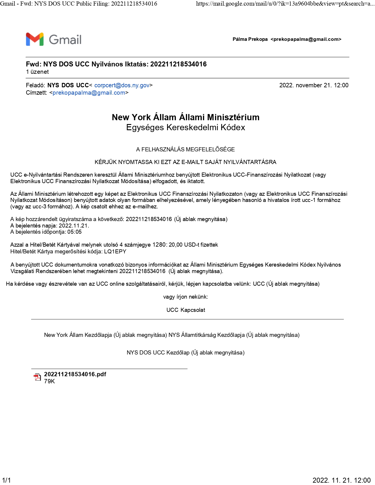 202211218534016 sz. UCC FINANCING STATEMENT AMENDMENT (UCC FINANSZÍROZÁSI NYILATKOZAT MÓDOSÍTÁS) (UCC Dok.), és annak elfogadása ("irányadó jog”: 2012-296-1209-2 sz. WA UCC Dok.: „..Ez az egyetlen elfogadás, amit kap…”), és ezek magyar fordításai: