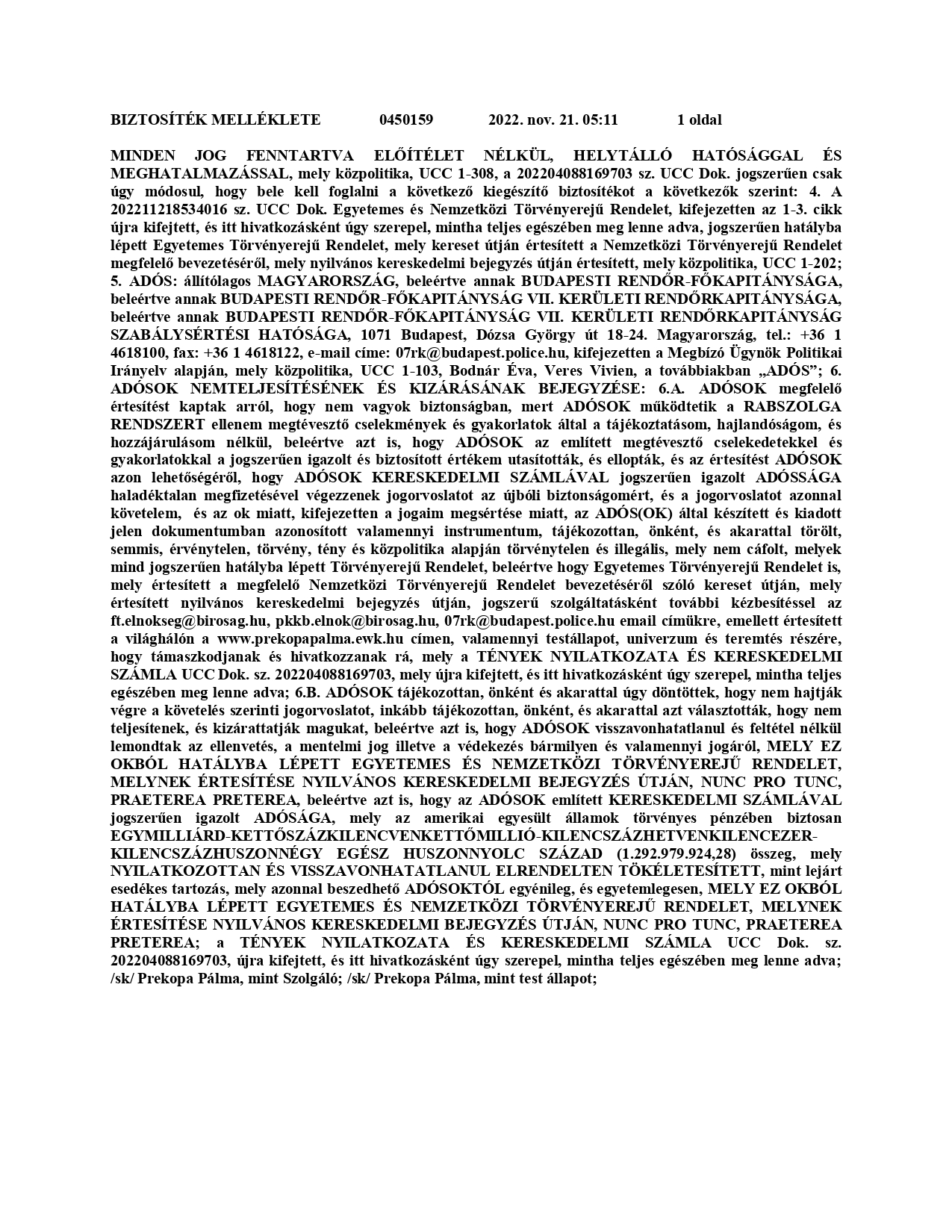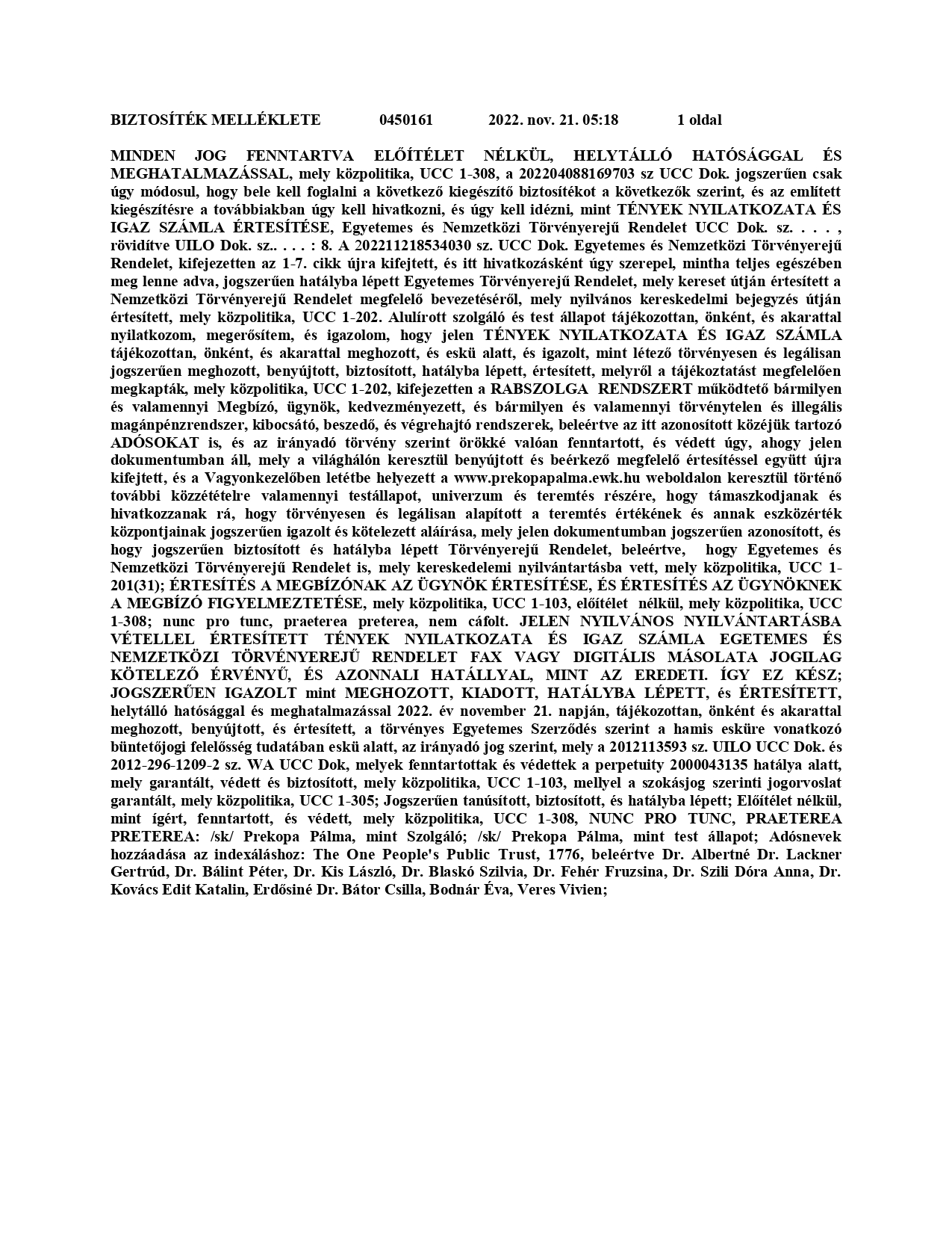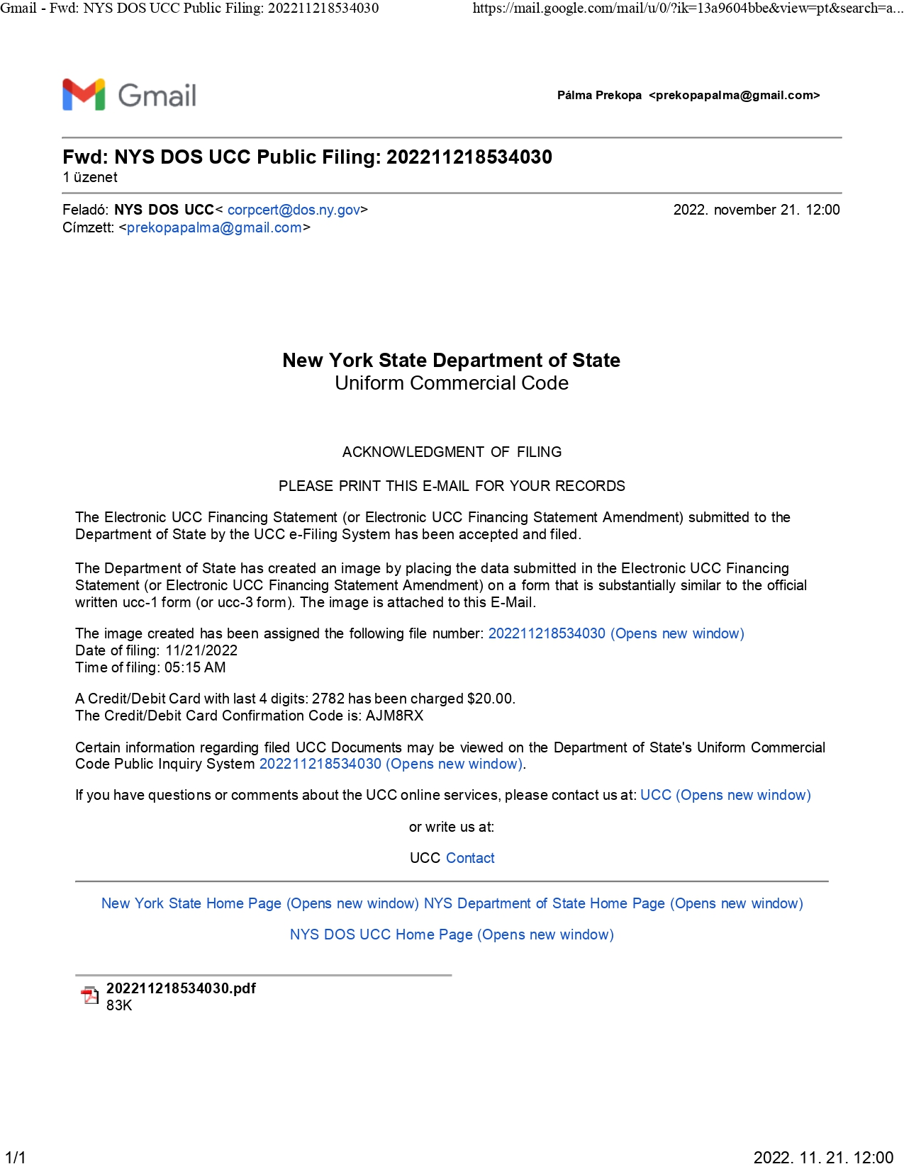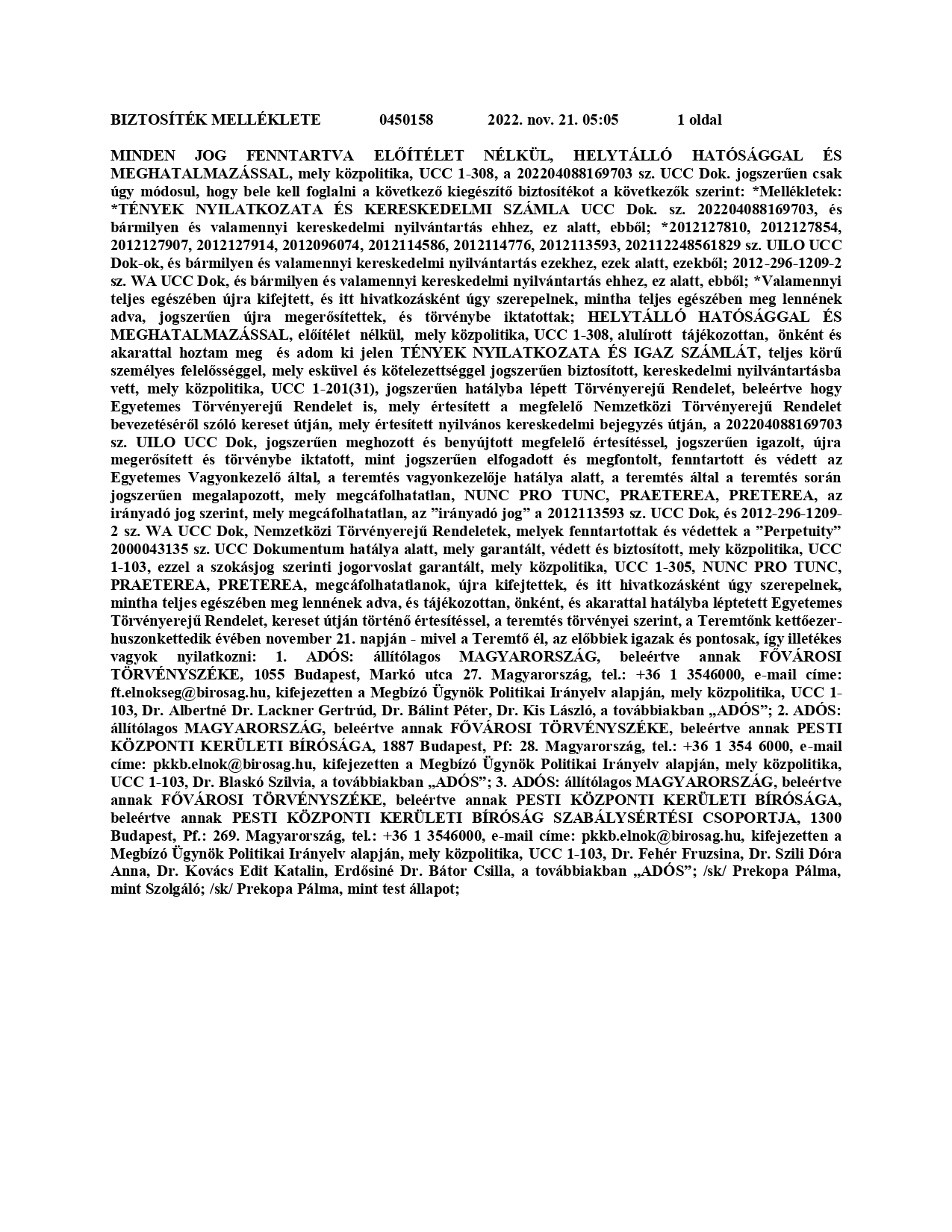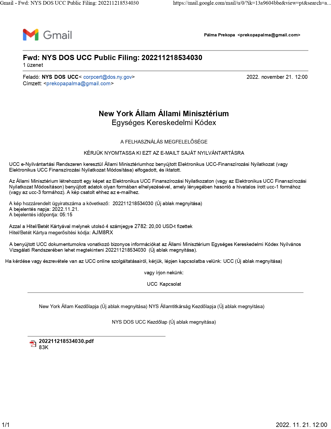 202211218534030 sz. UCC FINANCING STATEMENT AMENDMENT (UCC FINANSZÍROZÁSI NYILATKOZAT MÓDOSÍTÁS) (UCC Dok.), és annak elfogadása ("irányadó jog”: 2012-296-1209-2 sz. WA UCC Dok.: „..Ez az egyetlen elfogadás, amit kap…”), és ezek magyar fordításai:
