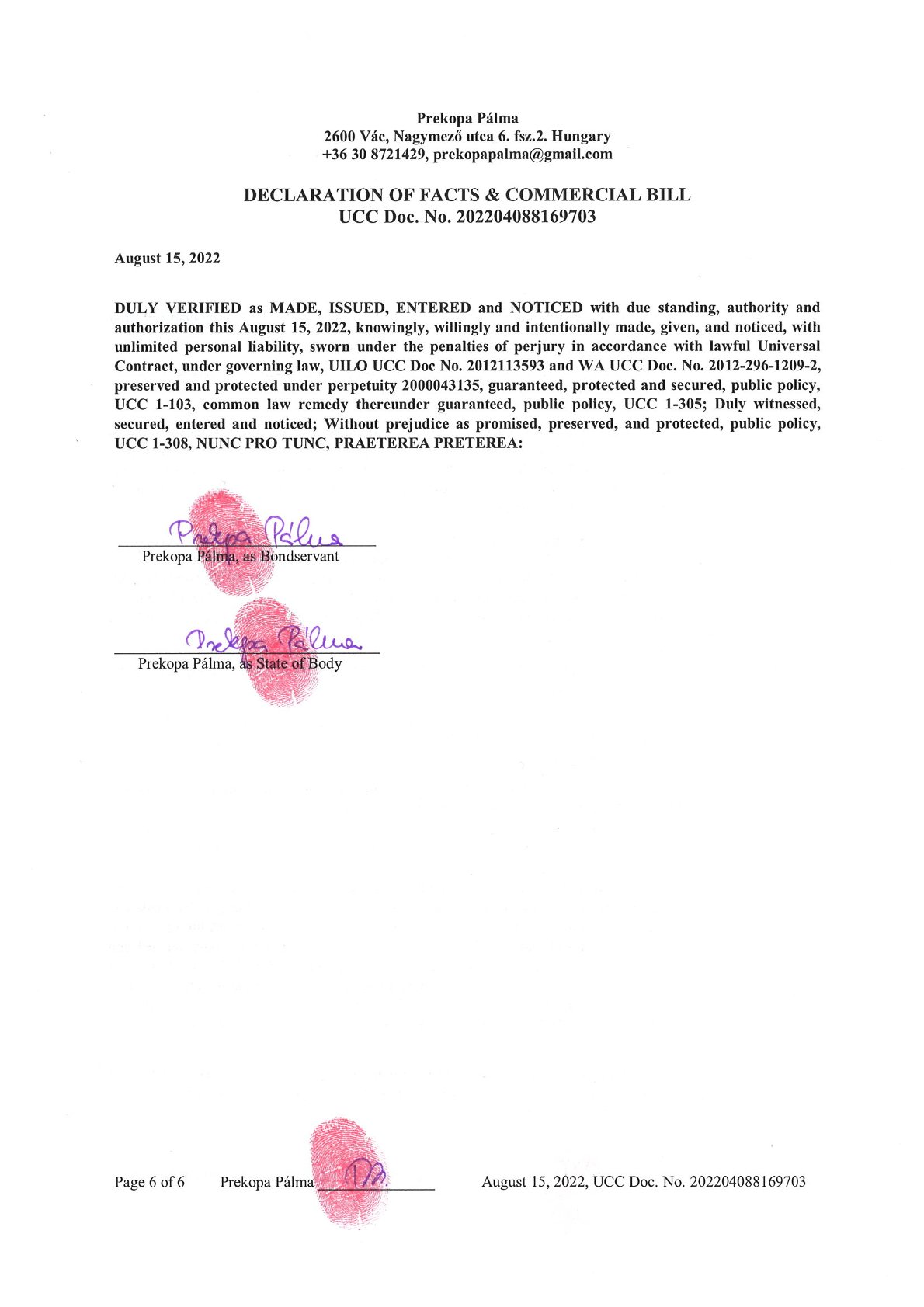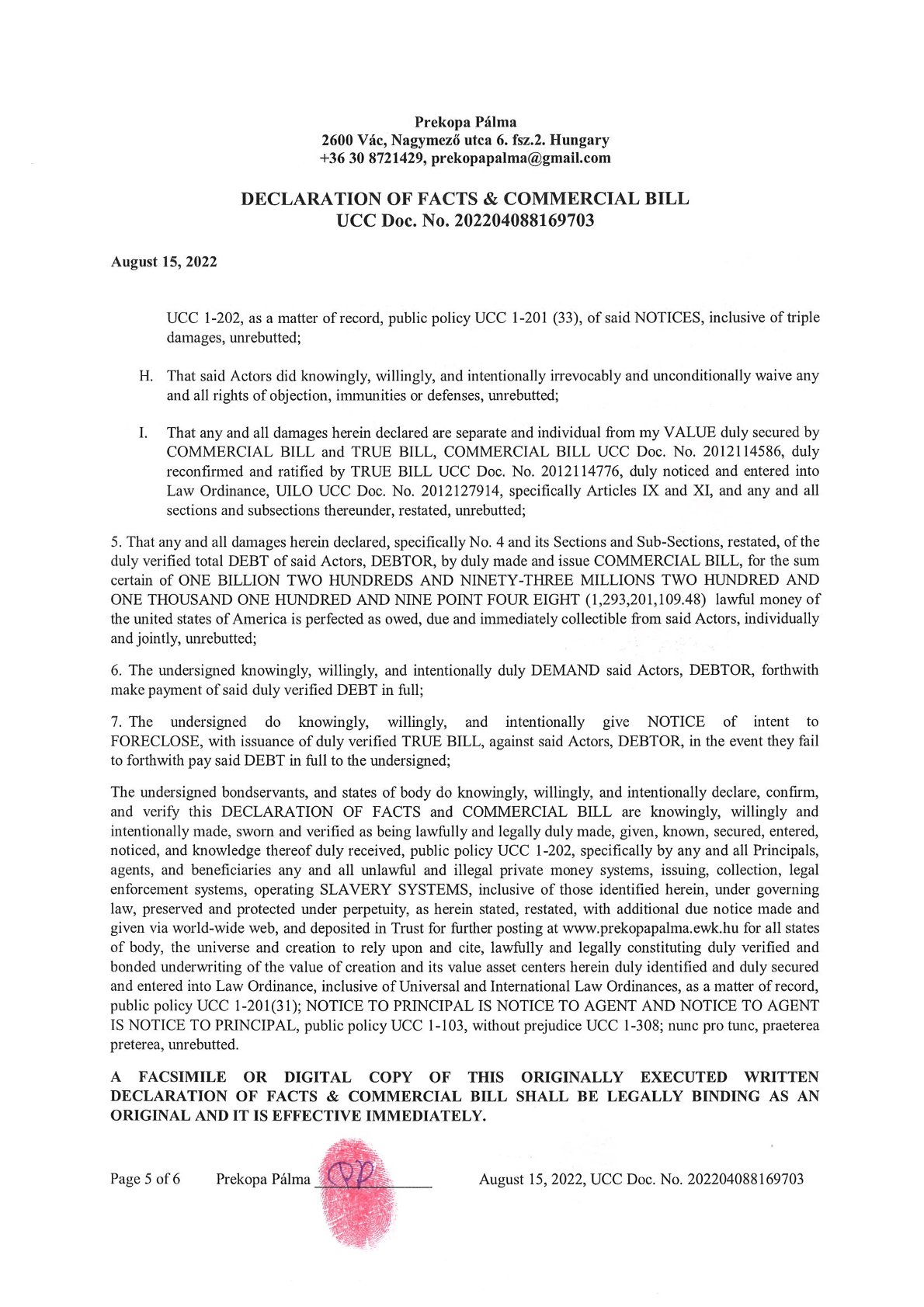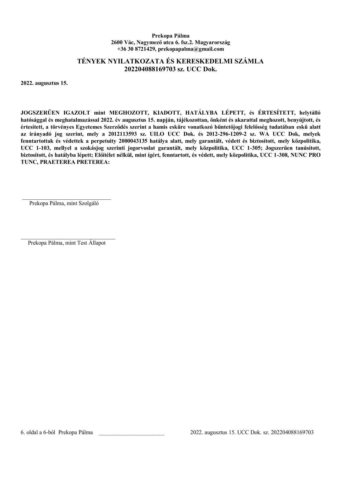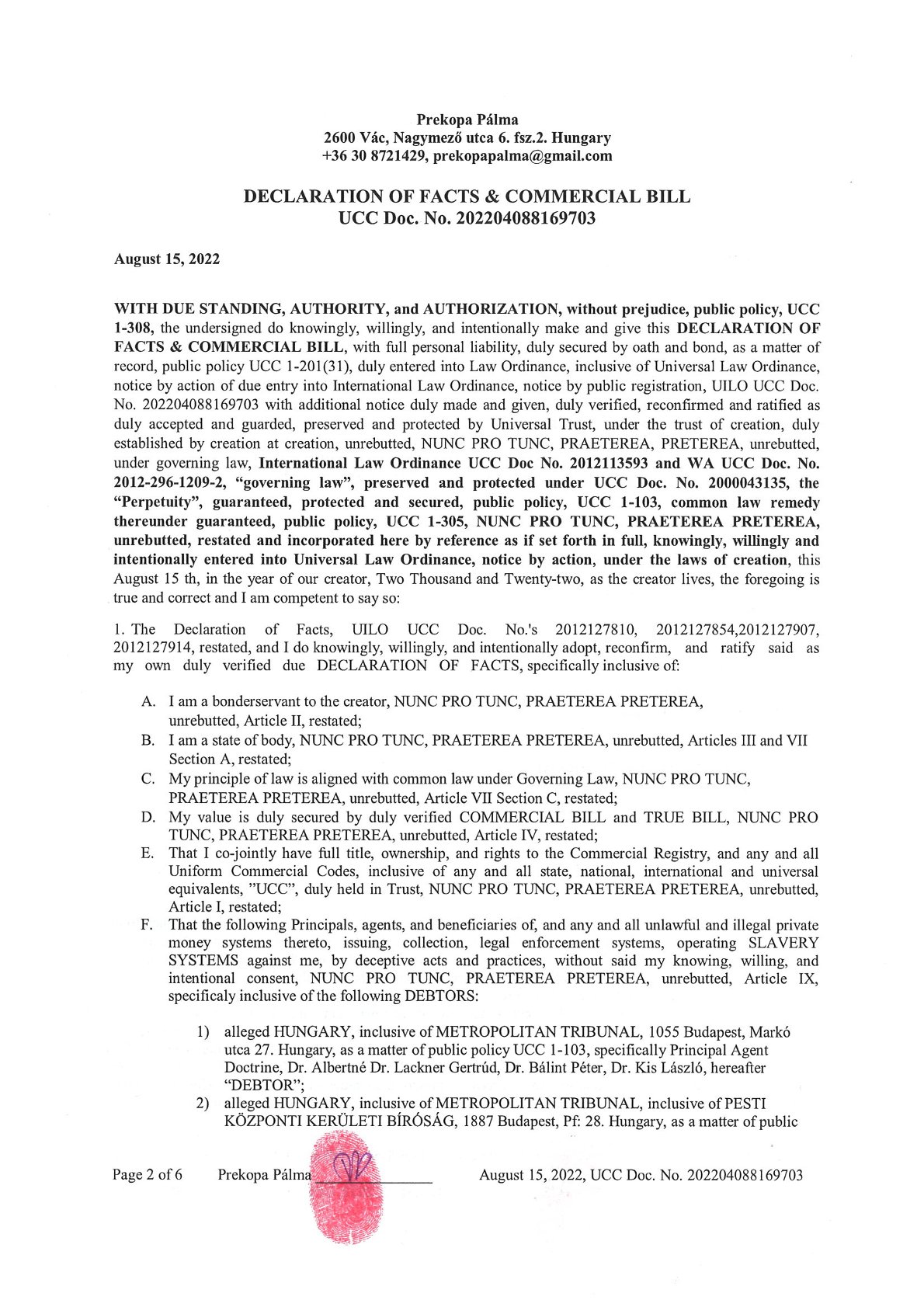 DECLARATION OF FACTS & COMMERCIAL BILL UCC Doc. No. 202204088169703 és magyar fordítása (TÉNYEK NYILATKOZATA ÉS KERESKEDELMI SZÁMLA)