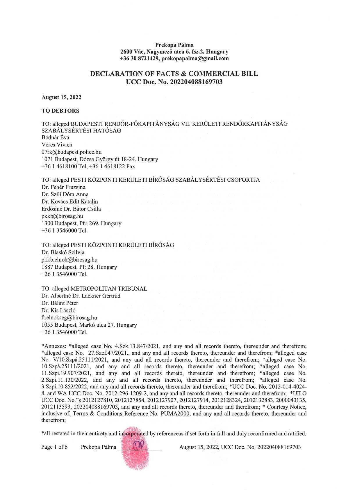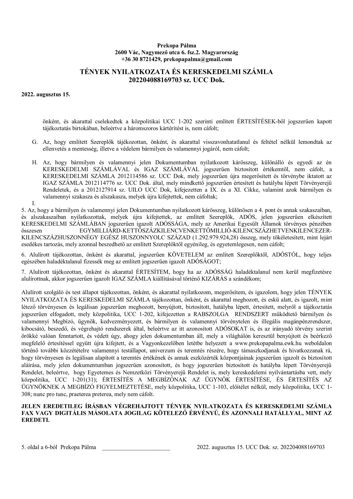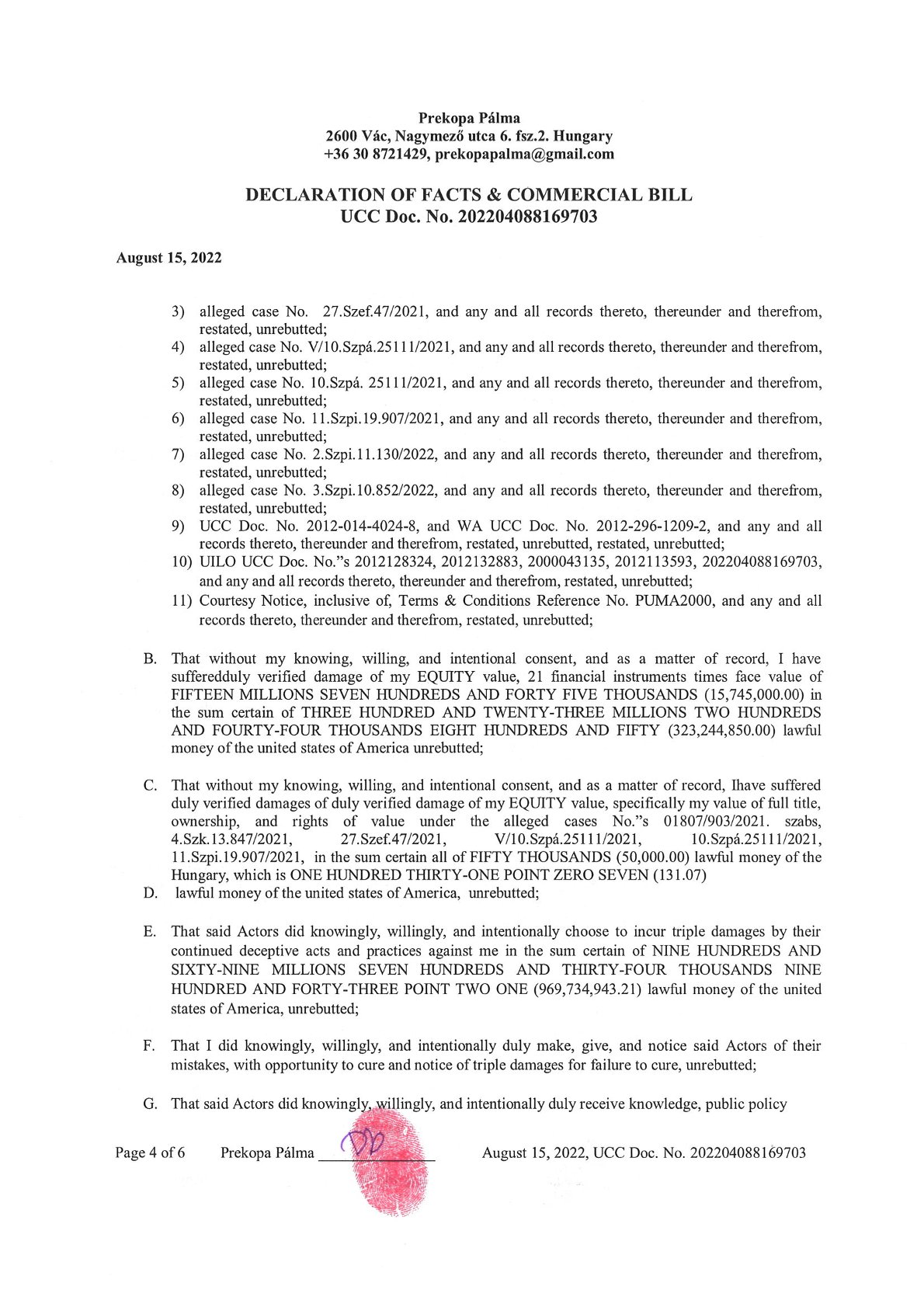 DECLARATION OF FACTS & COMMERCIAL BILL UCC Doc. No. 202204088169703 és magyar fordítása (TÉNYEK NYILATKOZATA ÉS KERESKEDELMI SZÁMLA)