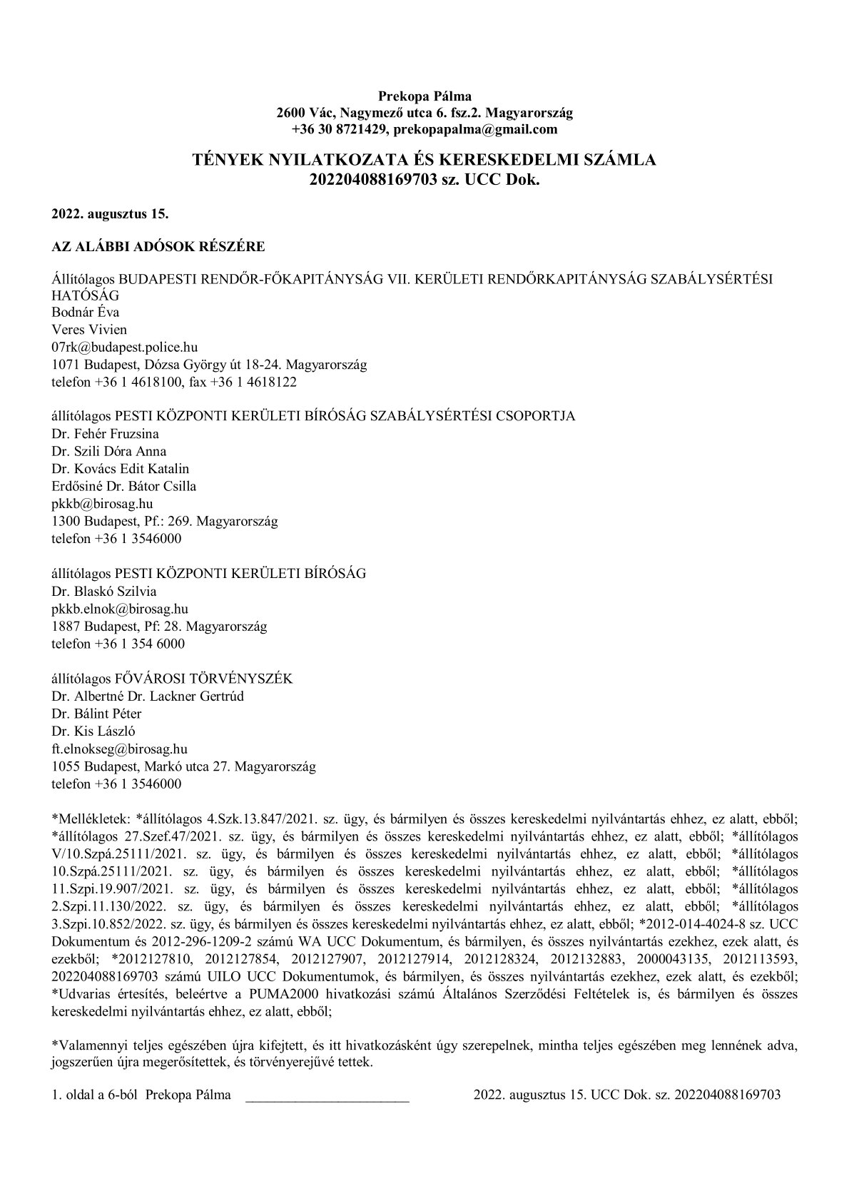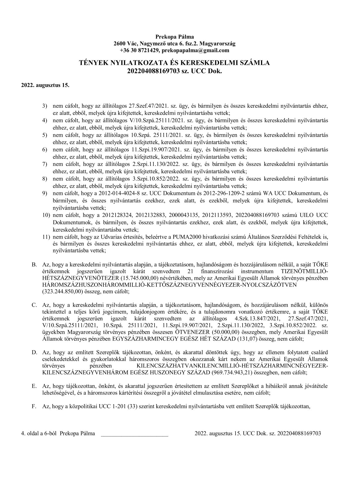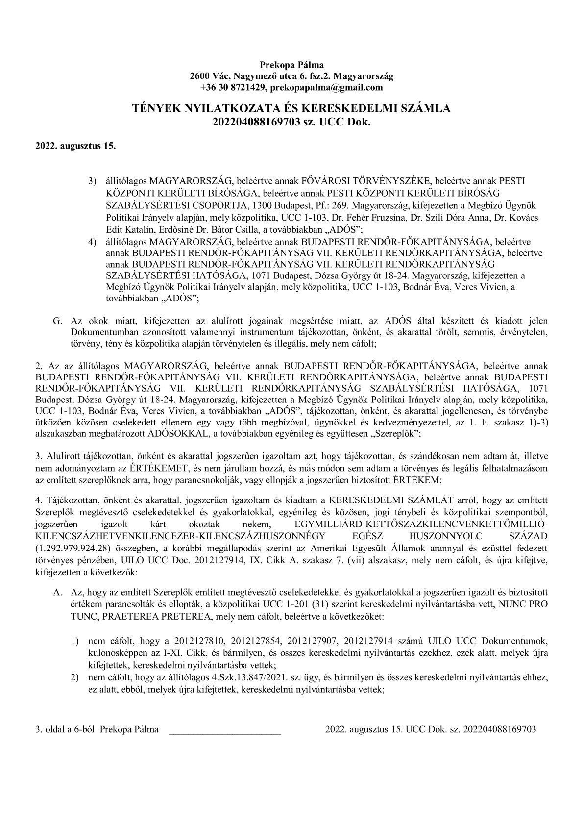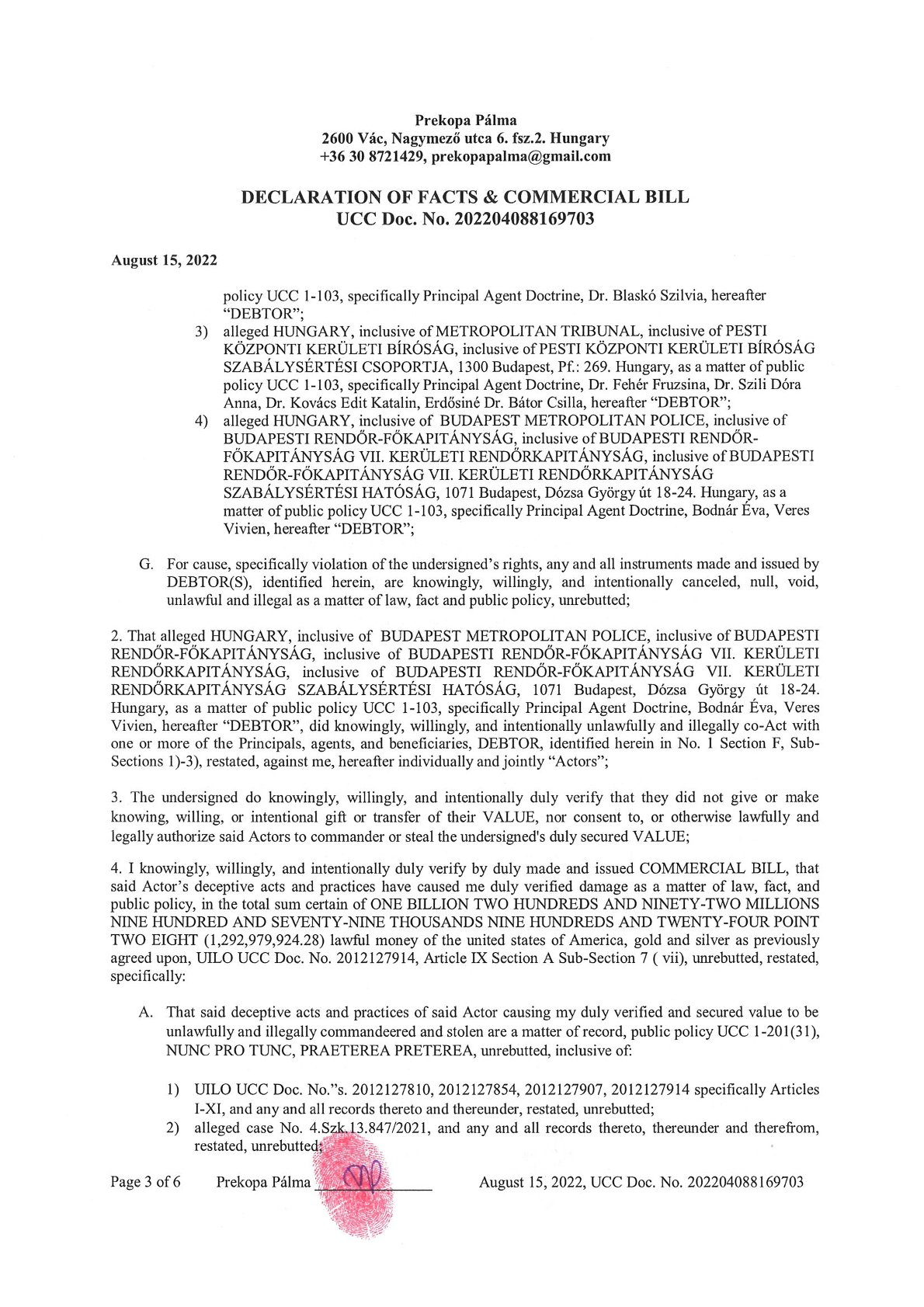 DECLARATION OF FACTS & COMMERCIAL BILL UCC Doc. No. 202204088169703 és magyar fordítása (TÉNYEK NYILATKOZATA ÉS KERESKEDELMI SZÁMLA)