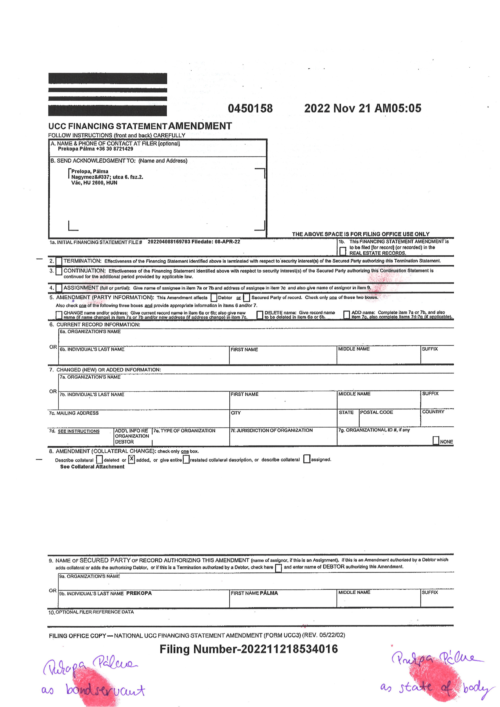 202211218534016 sz. UCC FINANCING STATEMENT AMENDMENT (UCC FINANSZÍROZÁSI NYILATKOZAT MÓDOSÍTÁS) (UCC Dok.), és annak elfogadása ("irányadó jog”: 2012-296-1209-2 sz. WA UCC Dok.: „..Ez az egyetlen elfogadás, amit kap…”), és ezek magyar fordításai: