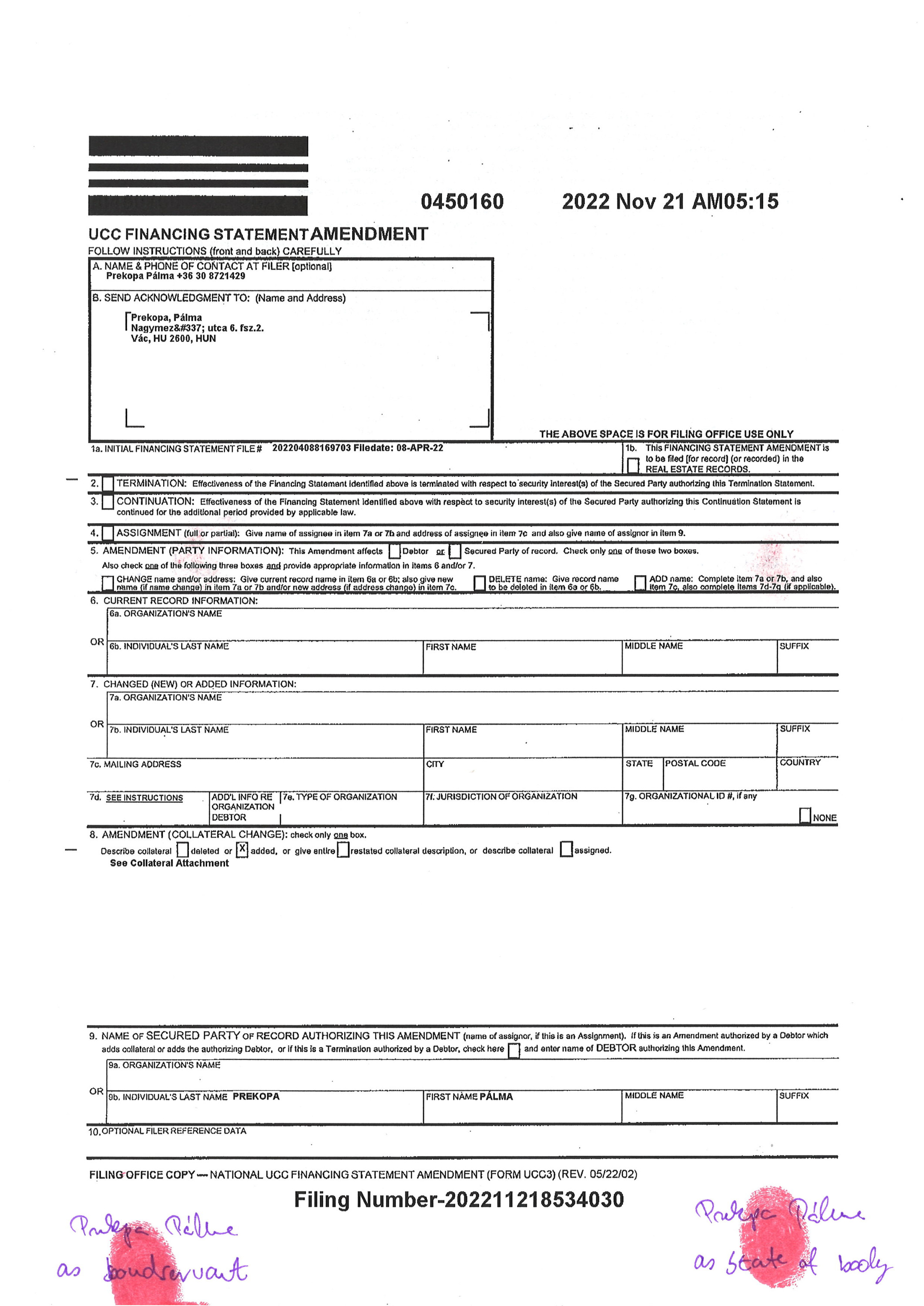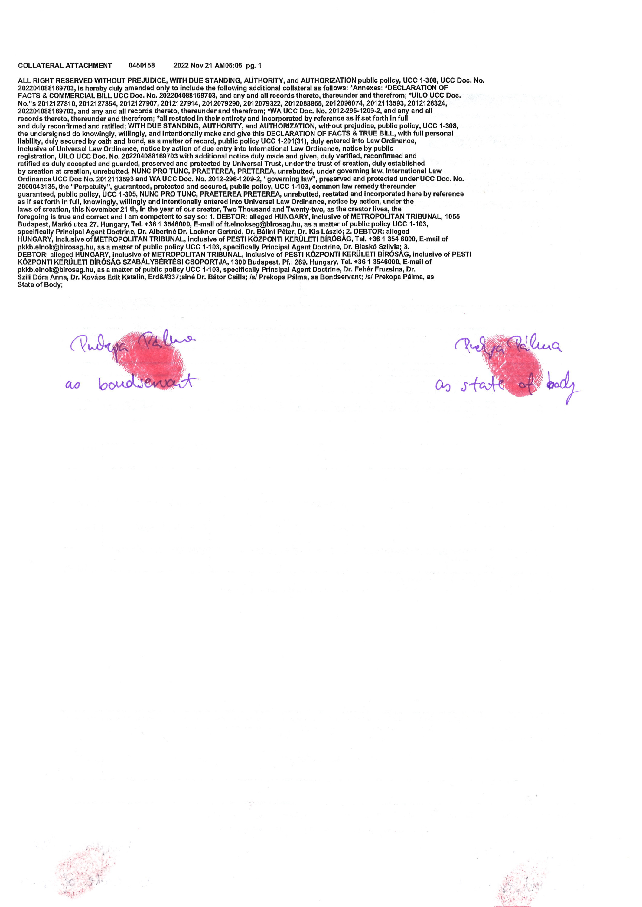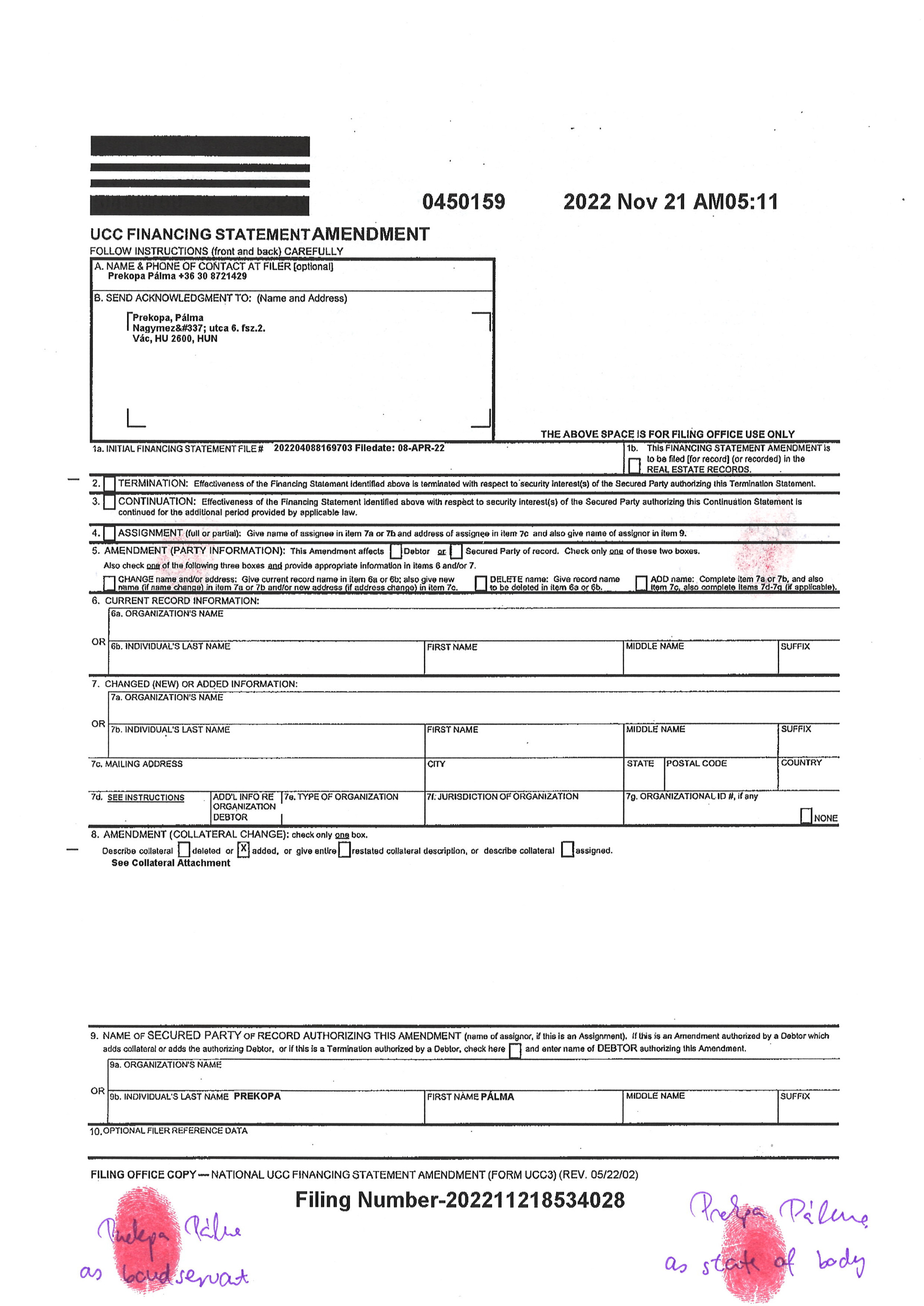 202211218534030 sz. UCC FINANCING STATEMENT AMENDMENT (UCC FINANSZÍROZÁSI NYILATKOZAT MÓDOSÍTÁS) (UCC Dok.), és annak elfogadása ("irányadó jog”: 2012-296-1209-2 sz. WA UCC Dok.: „..Ez az egyetlen elfogadás, amit kap…”), és ezek magyar fordításai: