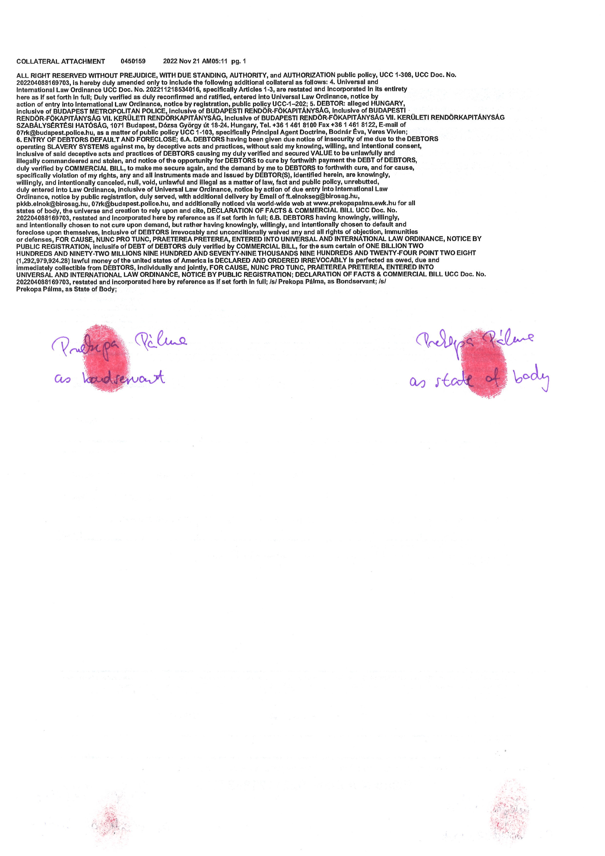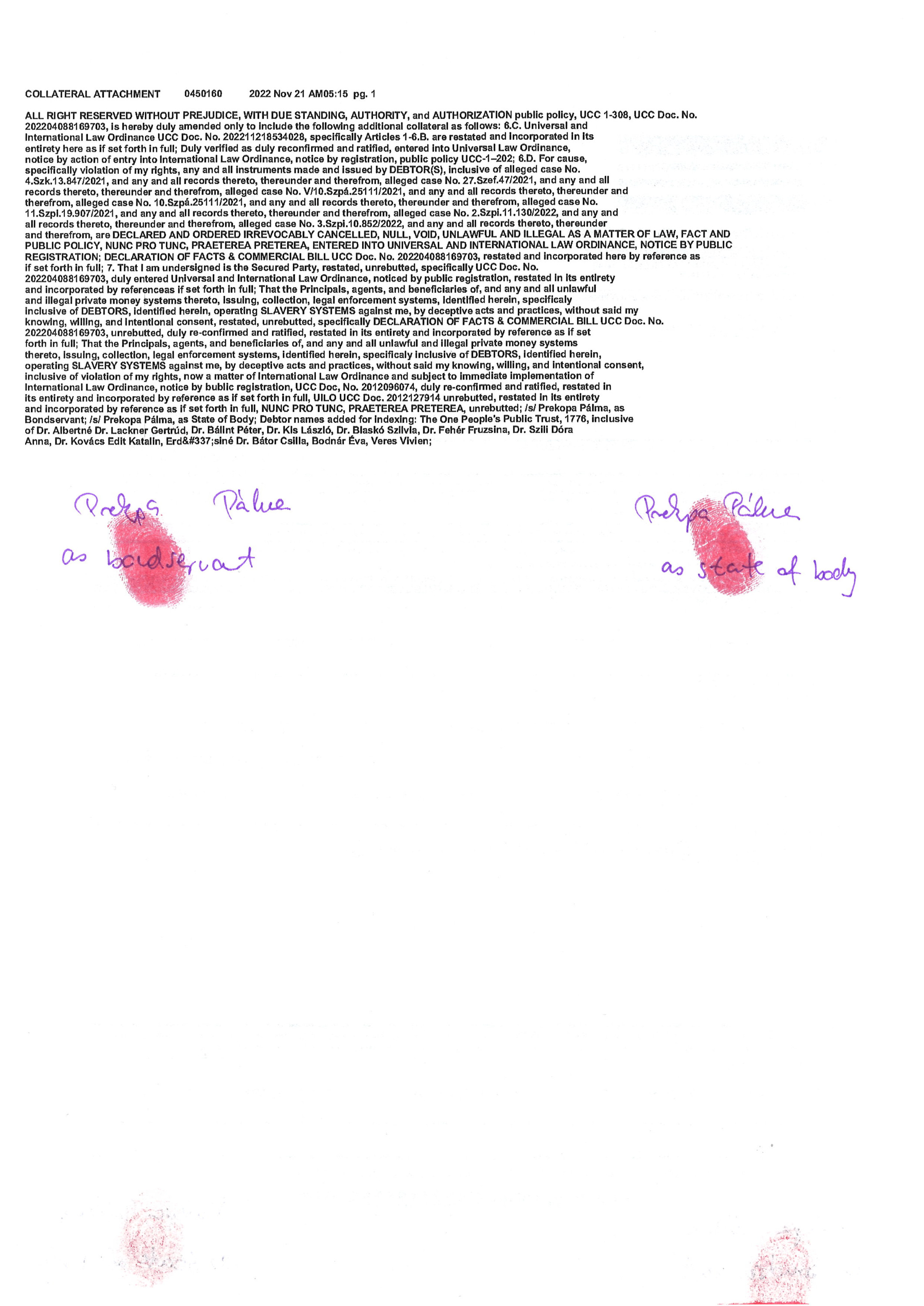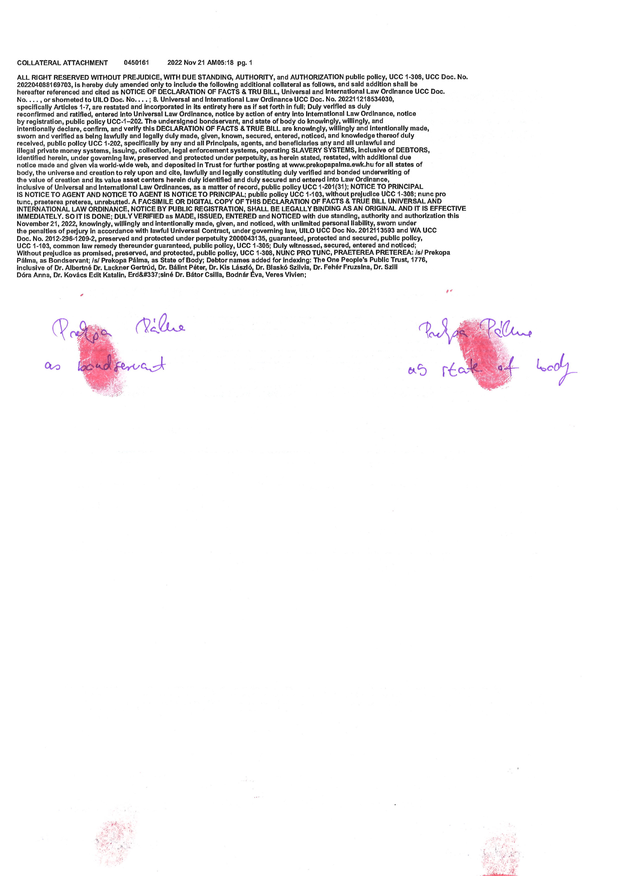 202211218534030 sz. UCC FINANCING STATEMENT AMENDMENT (UCC FINANSZÍROZÁSI NYILATKOZAT MÓDOSÍTÁS) (UCC Dok.), és annak elfogadása ("irányadó jog”: 2012-296-1209-2 sz. WA UCC Dok.: „..Ez az egyetlen elfogadás, amit kap…”), és ezek magyar fordításai: