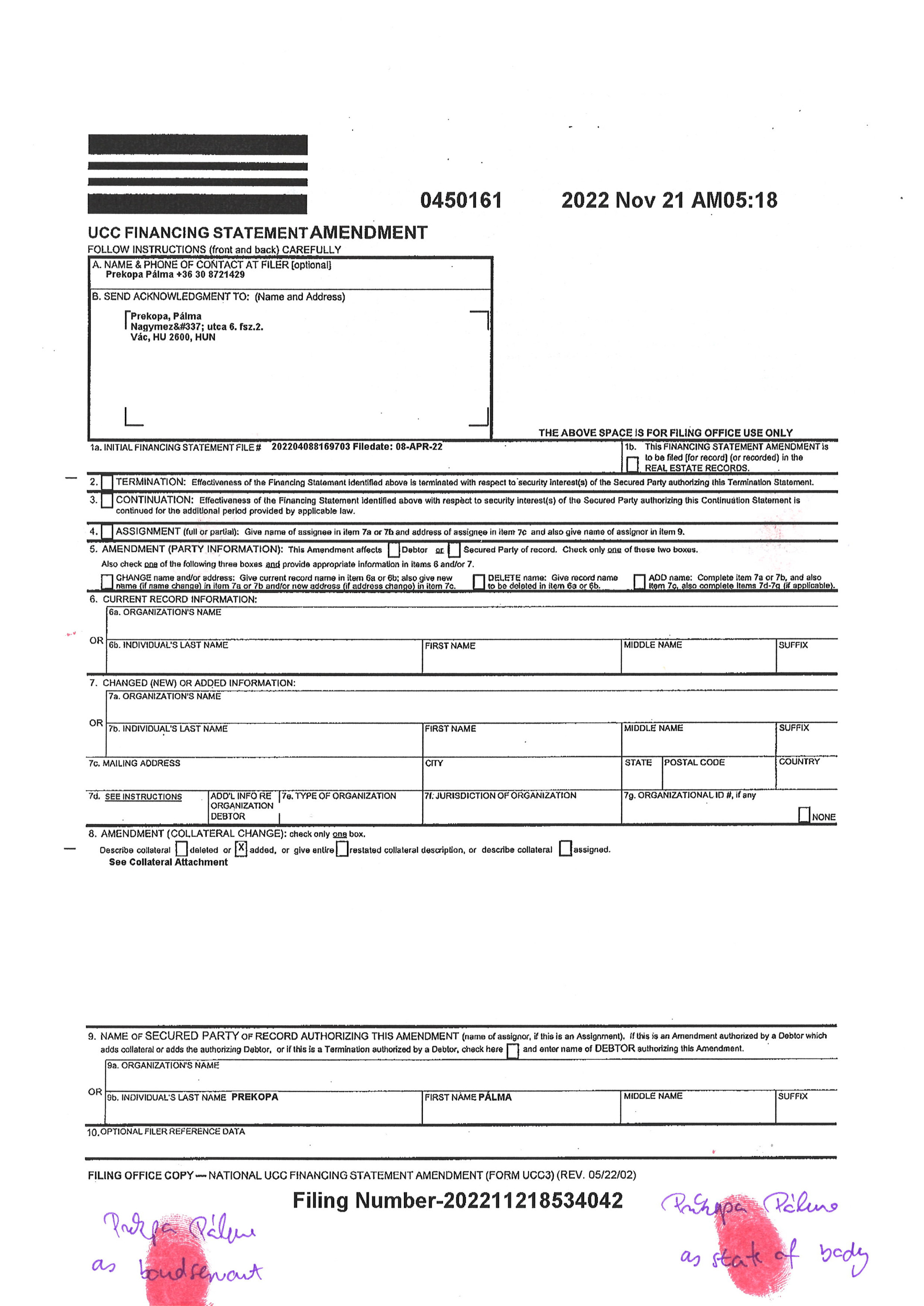 202211218534042 sz. UCC FINANCING STATEMENT AMENDMENT (UCC FINANSZÍROZÁSI NYILATKOZAT MÓDOSÍTÁS) (UCC Dok.), és annak elfogadása ("irányadó jog”: 2012-296-1209-2 sz. WA UCC Dok.: „..Ez az egyetlen elfogadás, amit kap…”), és ezek magyar fordításai: