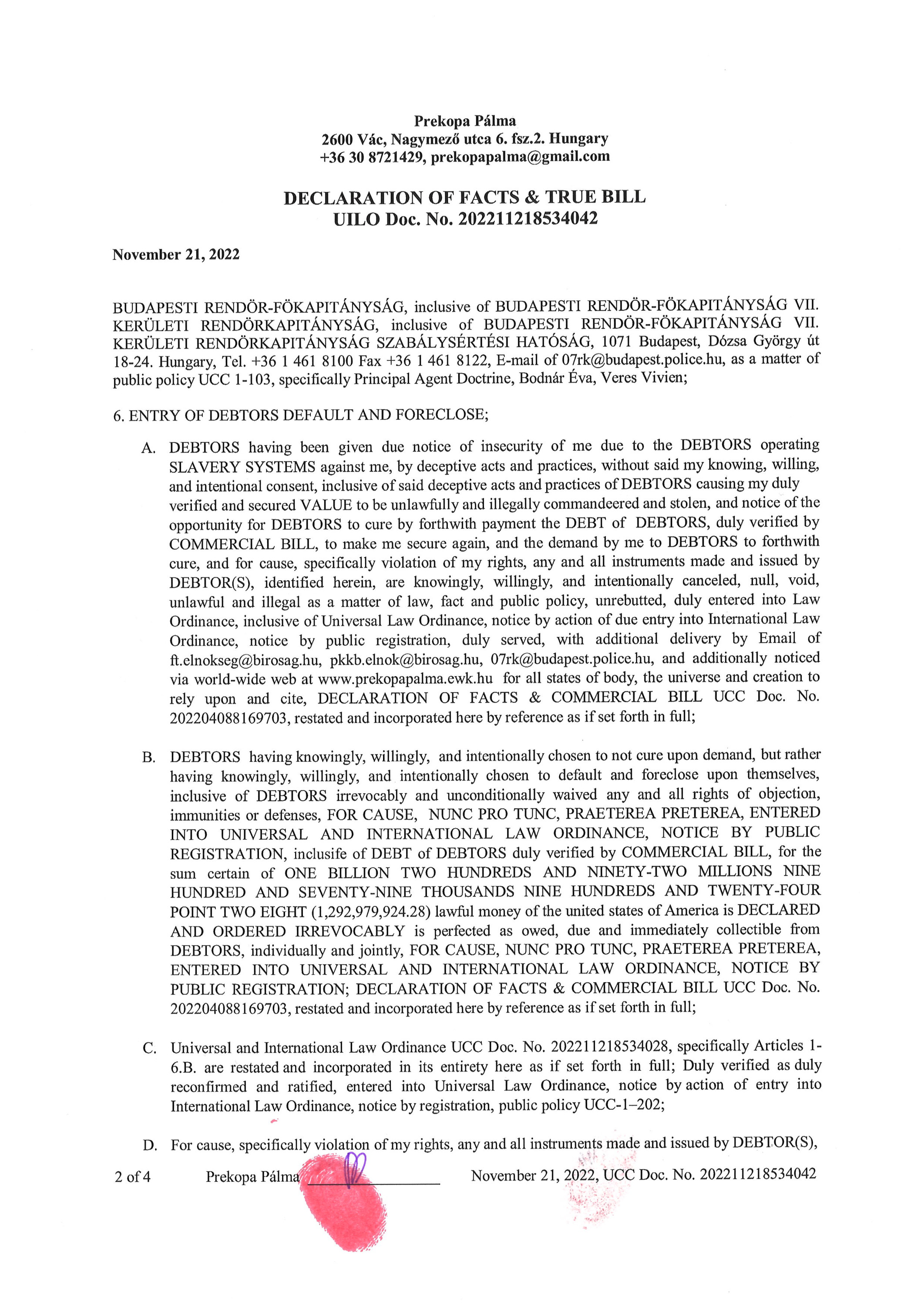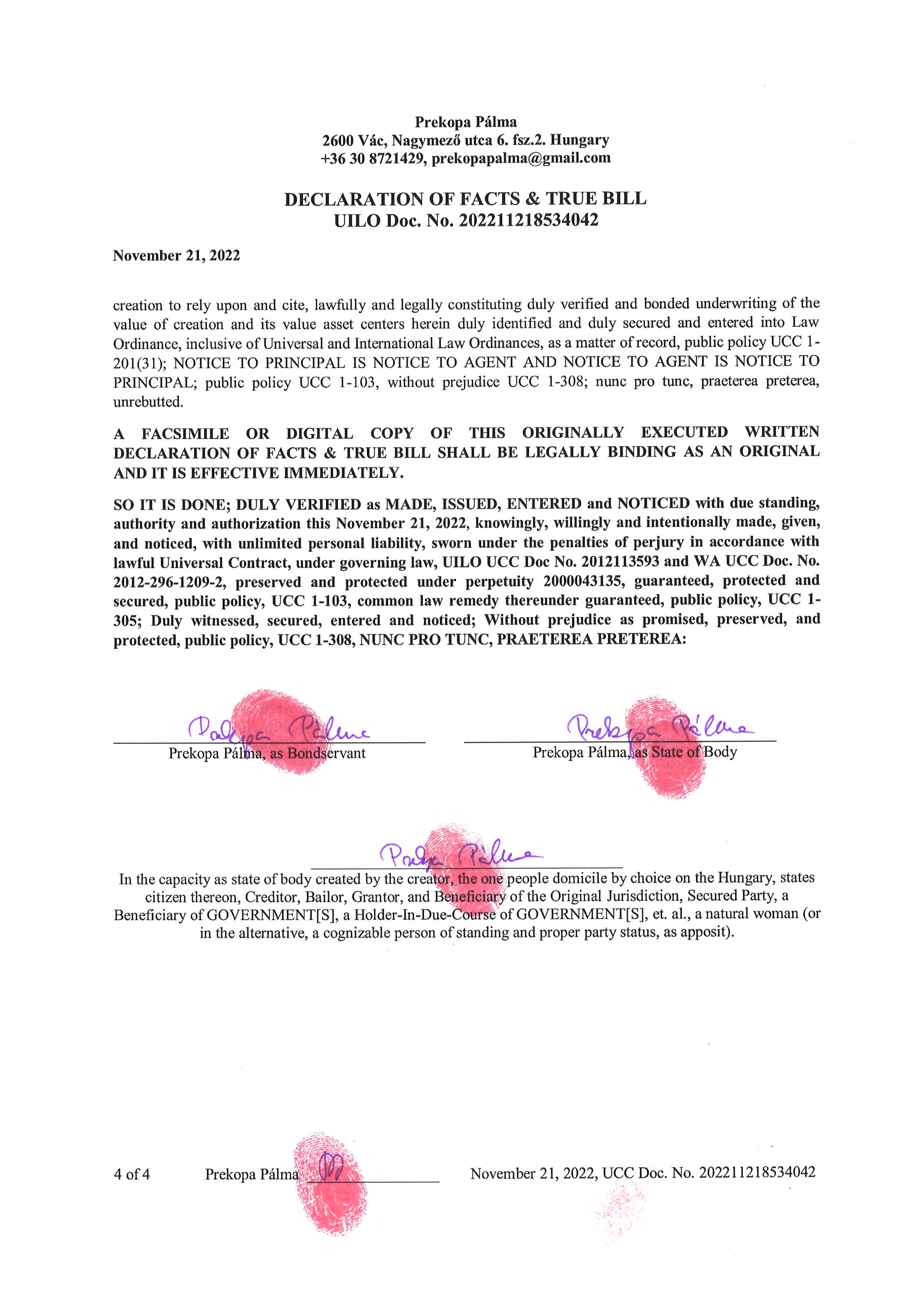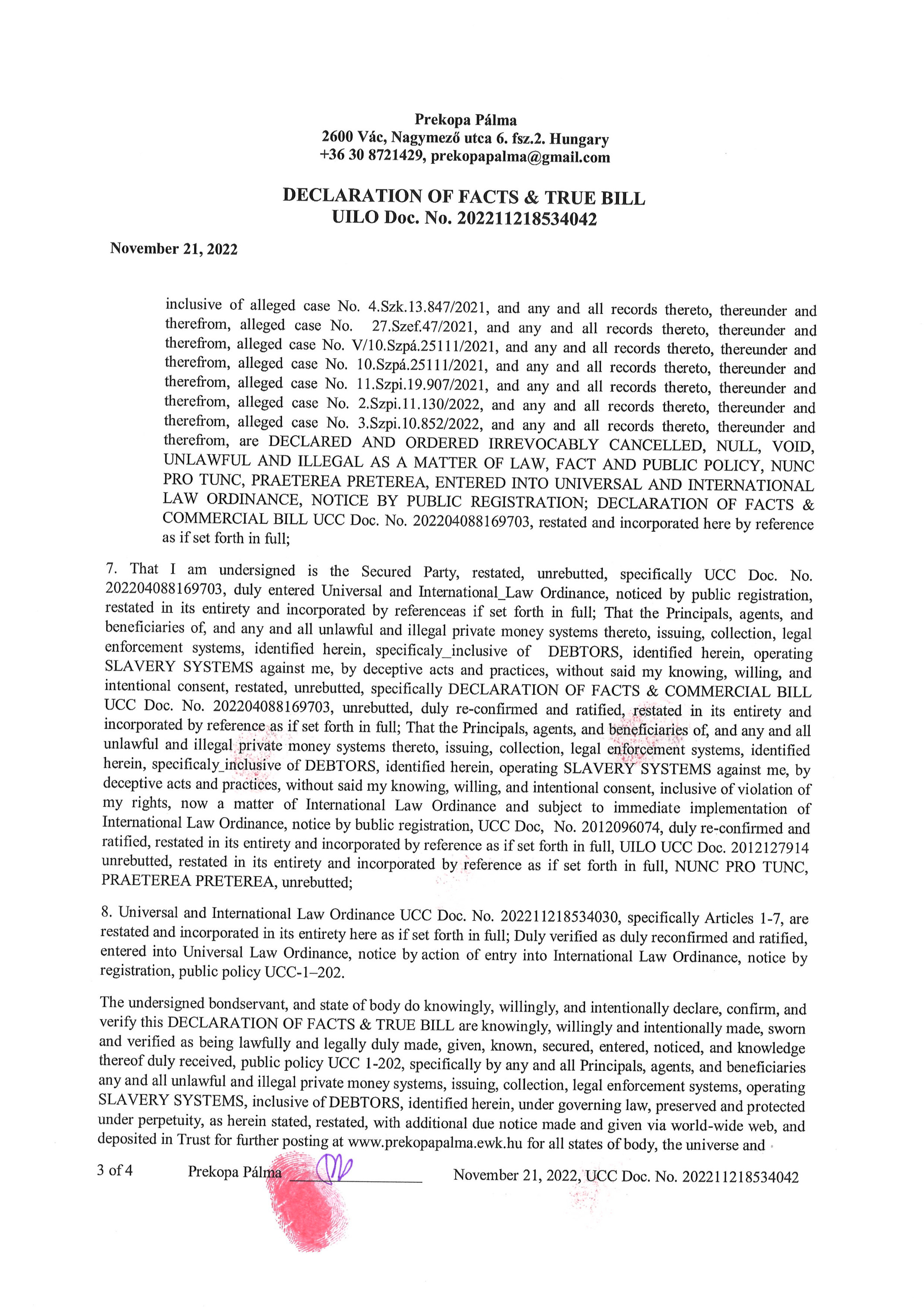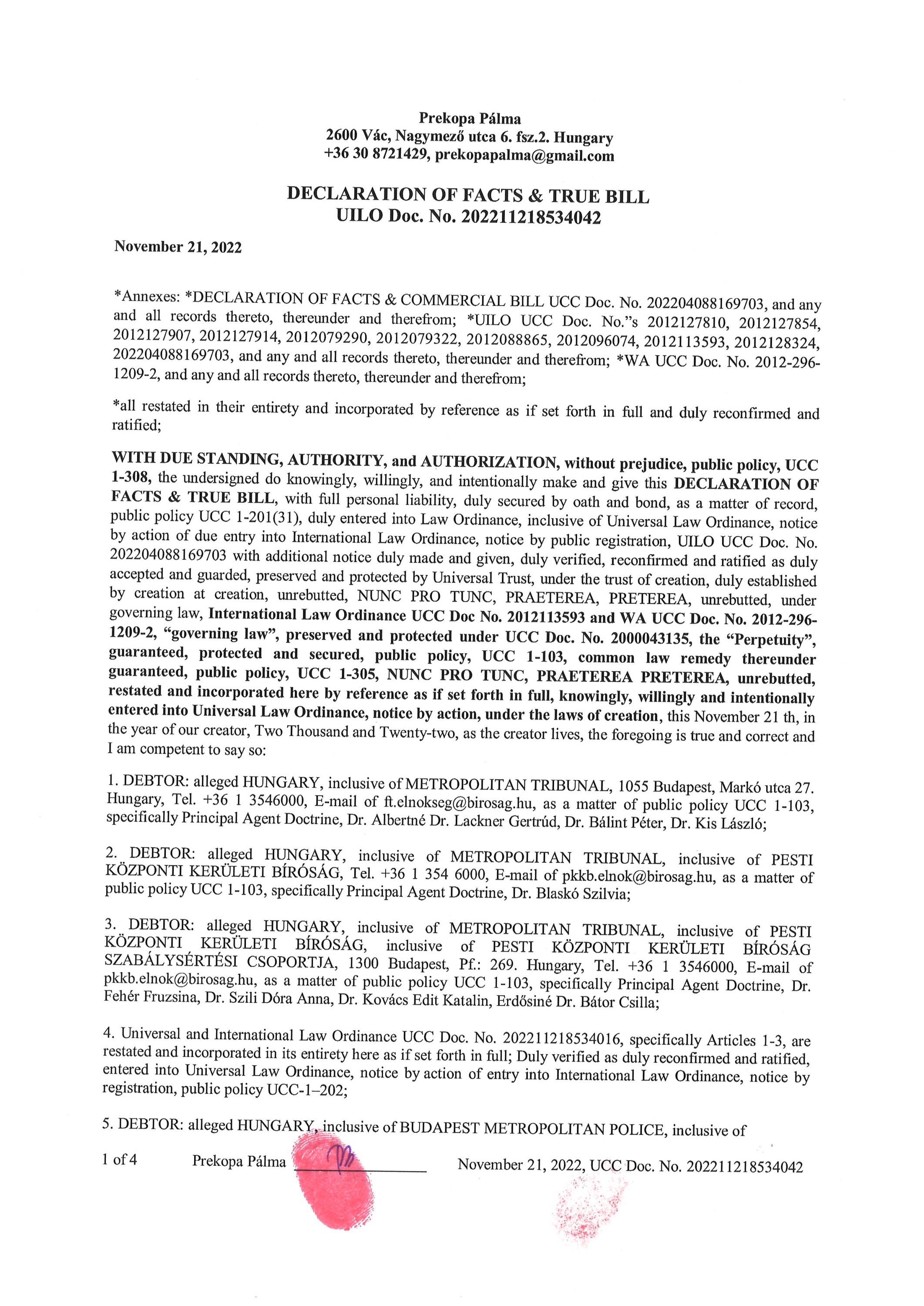 DECLARATION OF FACTS & TRUE BILL UILO Doc. No. 202211218534042 és magyar fordítása (TÉNYEK NYILATKOZATA ÉS IGAZ SZÁMLA)